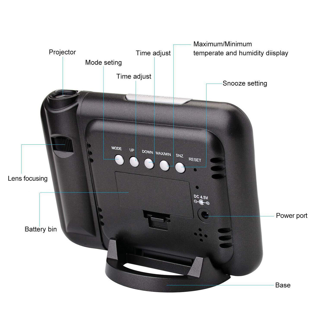 - Projection Alarm Clock, Digital Clock Projector on Ceiling with Indoor/Outdoor Temperature and thermometer Display, Alarms, Snooze, Colored Backlight, - Weather Forecast, and Battery Backup for Bedroom