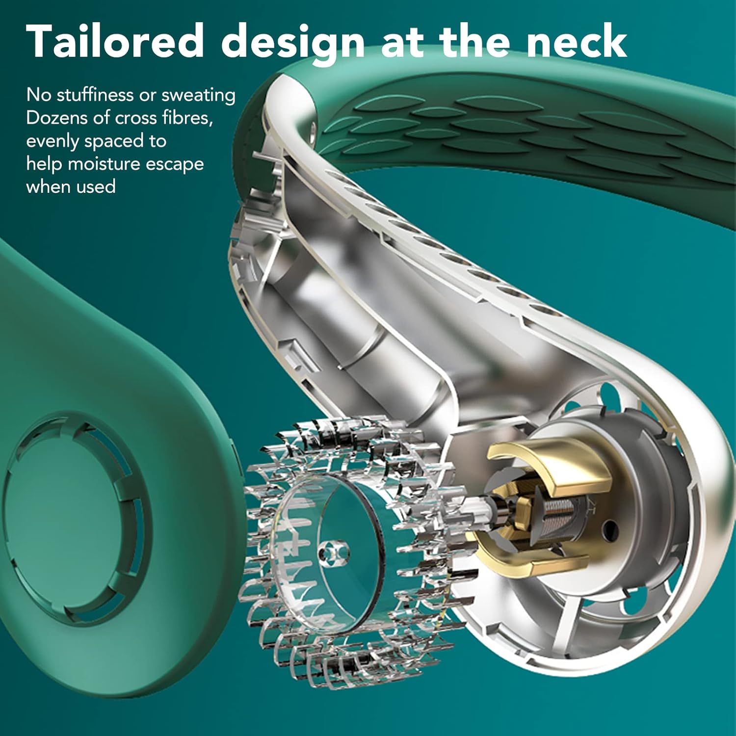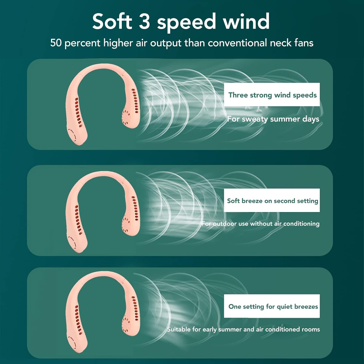 3 ADJUSTABLE SPEEDS: Portable wearable bladeless cooling fan with 3 speeds for different temperatures. ERGONOMIC DESIGN: Neck fan is ultra lightweight, reduces neck pressure and is not uncomfortable to wear for long periods of time. LARGE CAPACITY BATTERY: Neck fan has a high capacity battery and offers 1‑15 hours of operation (depending on the speed). ADJUSTABLE WIDTH: Neck fan has a fully enclosed body and the width of the neck fan can be adjusted at will, suitable for adults and children. SILENT OPERATION, HANDS FREE: Neck fan with brushless motor for low noise operation. Hands free design, freeing up your hands. Lightweight and portable.