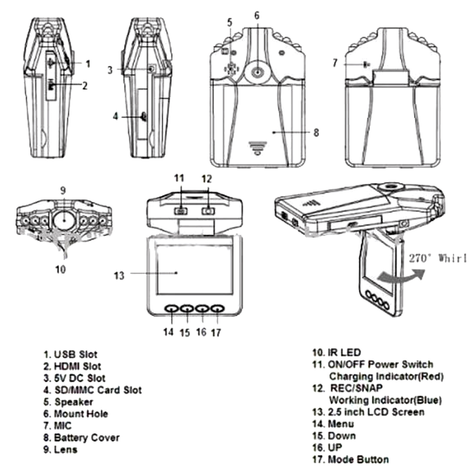 Item Features The HD DVR can capture high definition pictures and display it on its 2.5 inch TFT LCD Screen Recording automatically after the car's power up, this car camera will record and save the video files in the SD/MMC memory card With the camera holder/mount, you can fix it on the car dashboard or car windshield very easily The high quality video & audio can be timely and strong evidence to address accident and distinguish responsibility,it also a functional assistant of your private security For professional engaged in the work of police officers, journalists, detectives, lawyers, Taxi, etc. What's more, as a picture & video enthusiast, you will never let beautiful scenery pass you by Item specifics Model: H198 Car DVR with 6 IR LED LCD Screen : 2.5" 720x480,270° Whirl Video Resolution: 720P Video format: AVI Memorizer:SD/MMC card(from 1 GB up to 32GB) Interface: AV-Out,SD/MMC,USB2.0 Power Source:Built-in rechargeable battery or 12V/24V Car Charger Repeat Storage by Section:: 2/5/15 minutes Microphone: Built-in,can record sound Other function: Motion Detection,LED Display,Gravity Sensor,Real-time Recording,Night Vision and so om Language: English, Simplified Chinese, Tranditional Chinese, Japanese,French, Spanish, Italian, German, Russian,Portuguese Package Content Car DVR 1pcs Car Mount 1pcs Car Charger 1pcs USB Cable 1pcs User Manual 1pcs