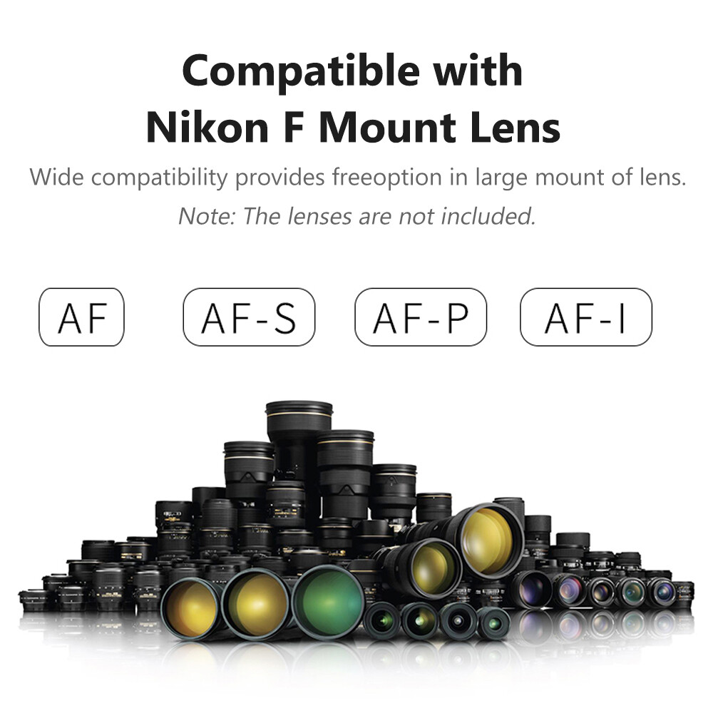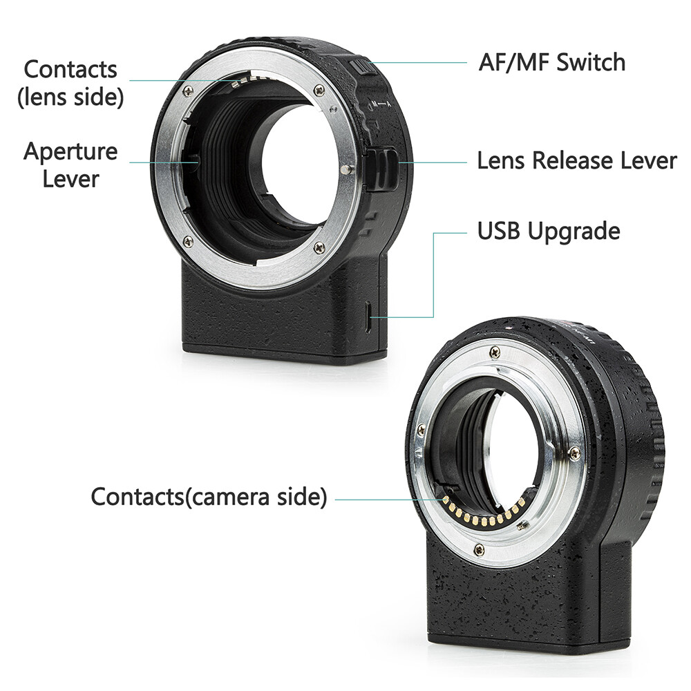 Features:For F Mount Lens: The mount adapter is designed for compatible with Nikon F mount series lenses to MFT M4/3 cameras.AF & MF Switchable: Quick and smooth auto focus ensures premium experience in photography. Focus mode can be changed to manual focus via switch.EXIF Signal Transmission: Metal contacts provide high conductivity, information like shutter, aperture and ISO can be monitored via camera screen.Support Lens VR: Mount adapter supports lens VR technology, effectively reduce vague or ghost due to vibration caused by active shooting or handheld shaking.USB Firmware Upgrade: Built-in firmware upgrade jack for upgrading newly model cameras and lenses, for wider compatibility.