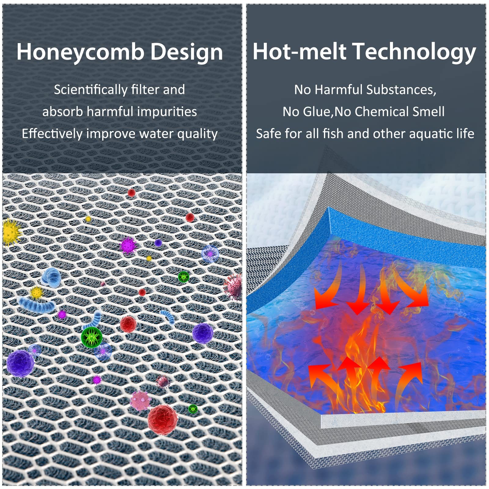 【Improve Water Quality】: With Upgraded Honeycomb Shape Design, the filter pads for aquarium have strong water permeability, which can scientifically filter and absorb the harmful bacterial impurities, easily establish nitrification system, stabilize the cultivation of nitrifying bacteria, provide clean water and safe living environment for fish and other aquatic life.