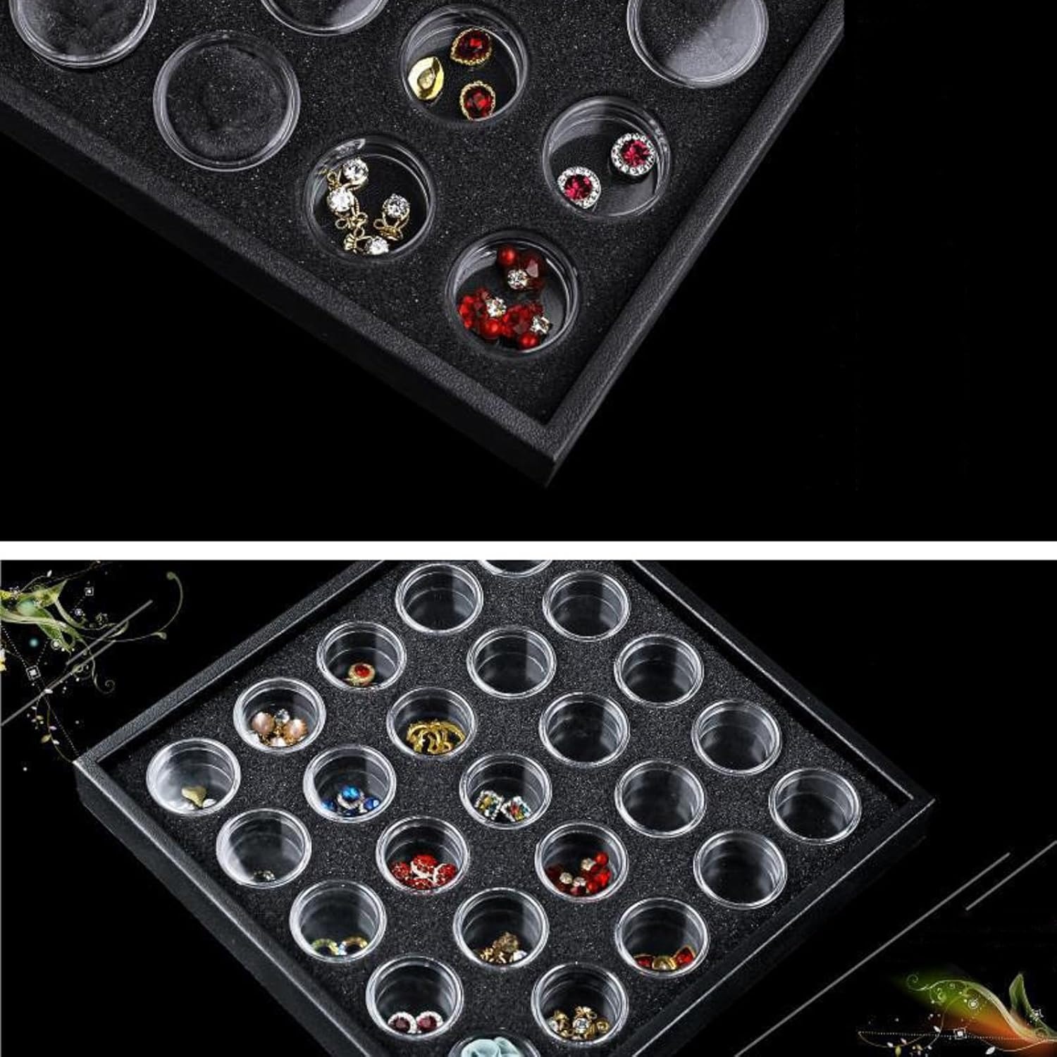 Package include: Each package has 25 detachable small transparent jewelry cases stored in a large tray for display. (Note: Do not include loose gems)