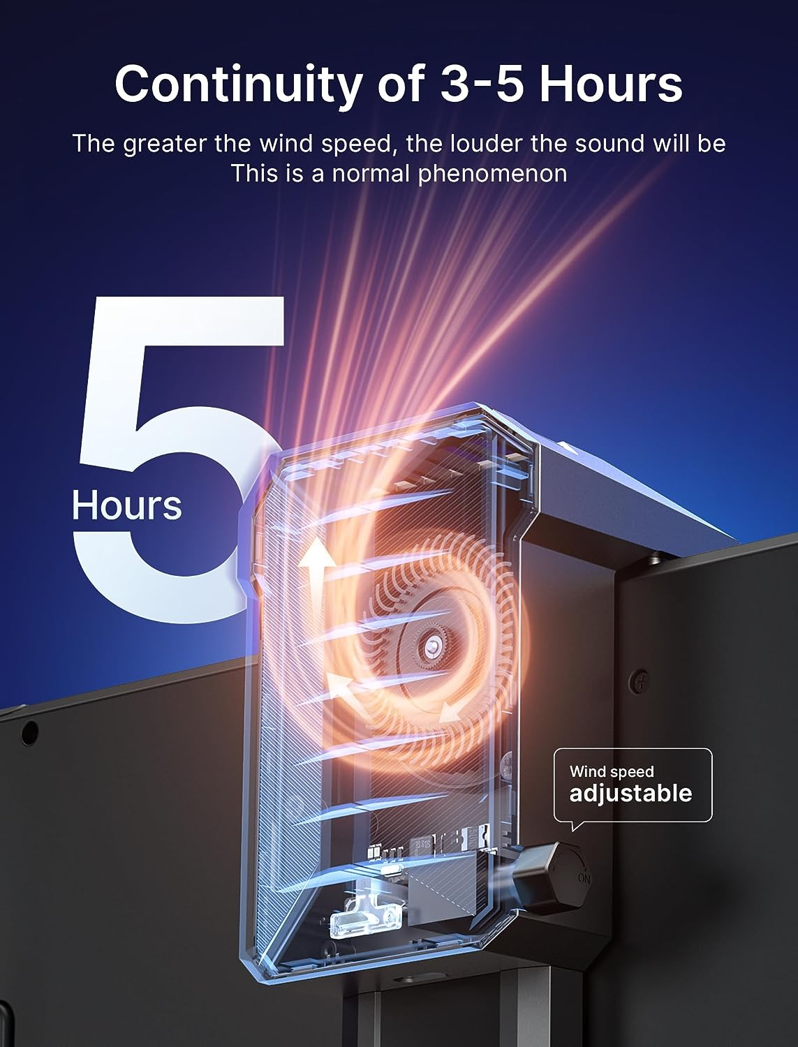 Perfect Duration of 3-5 Hours : The cooling fan's speed can be adjusted from 0-100% using a handy knob, with a maximum duration of over 3 hours at full speed, and up to 5 hours at the minimum setting. Please note: a higher wind speed will result in a louder sound, which is a normal occurrence.