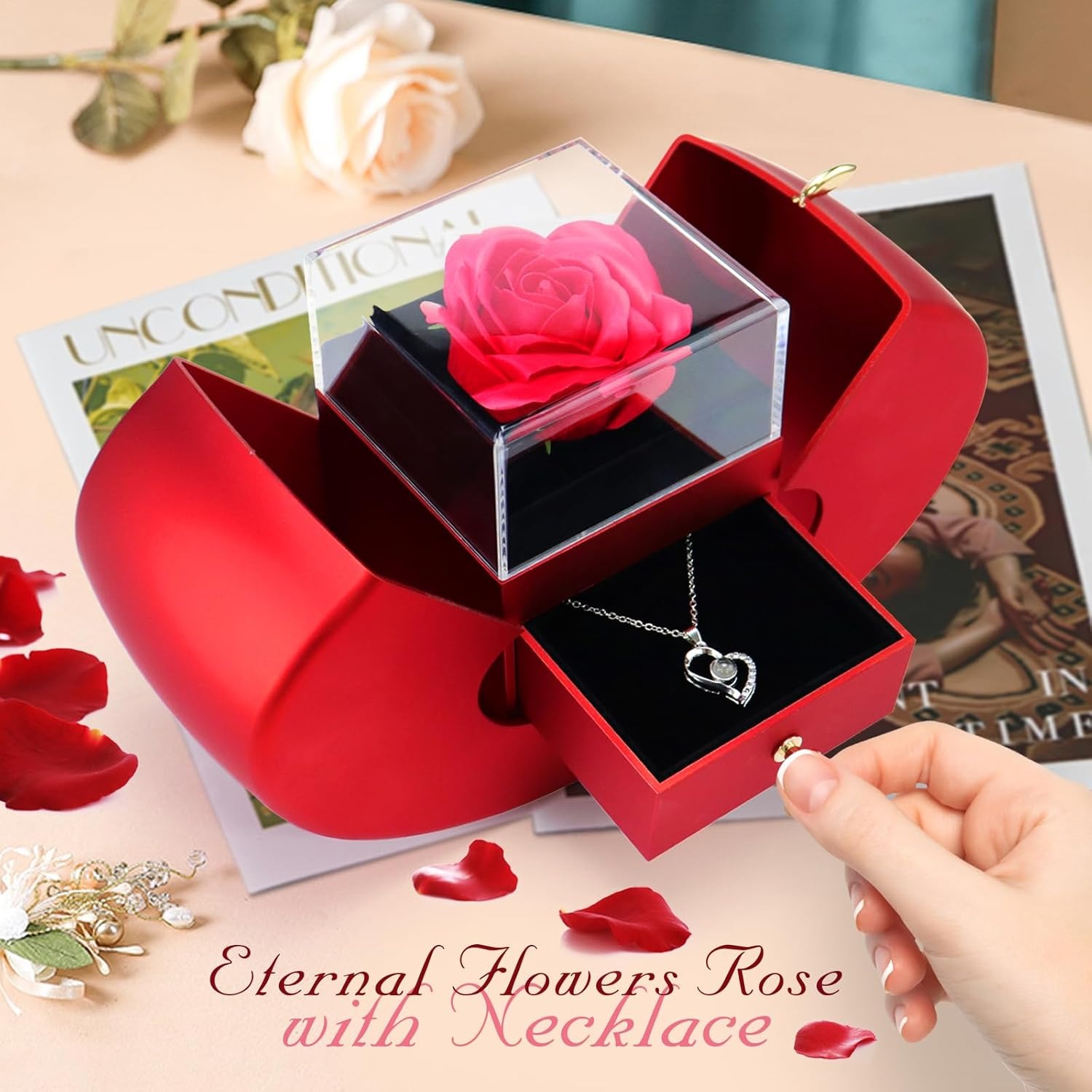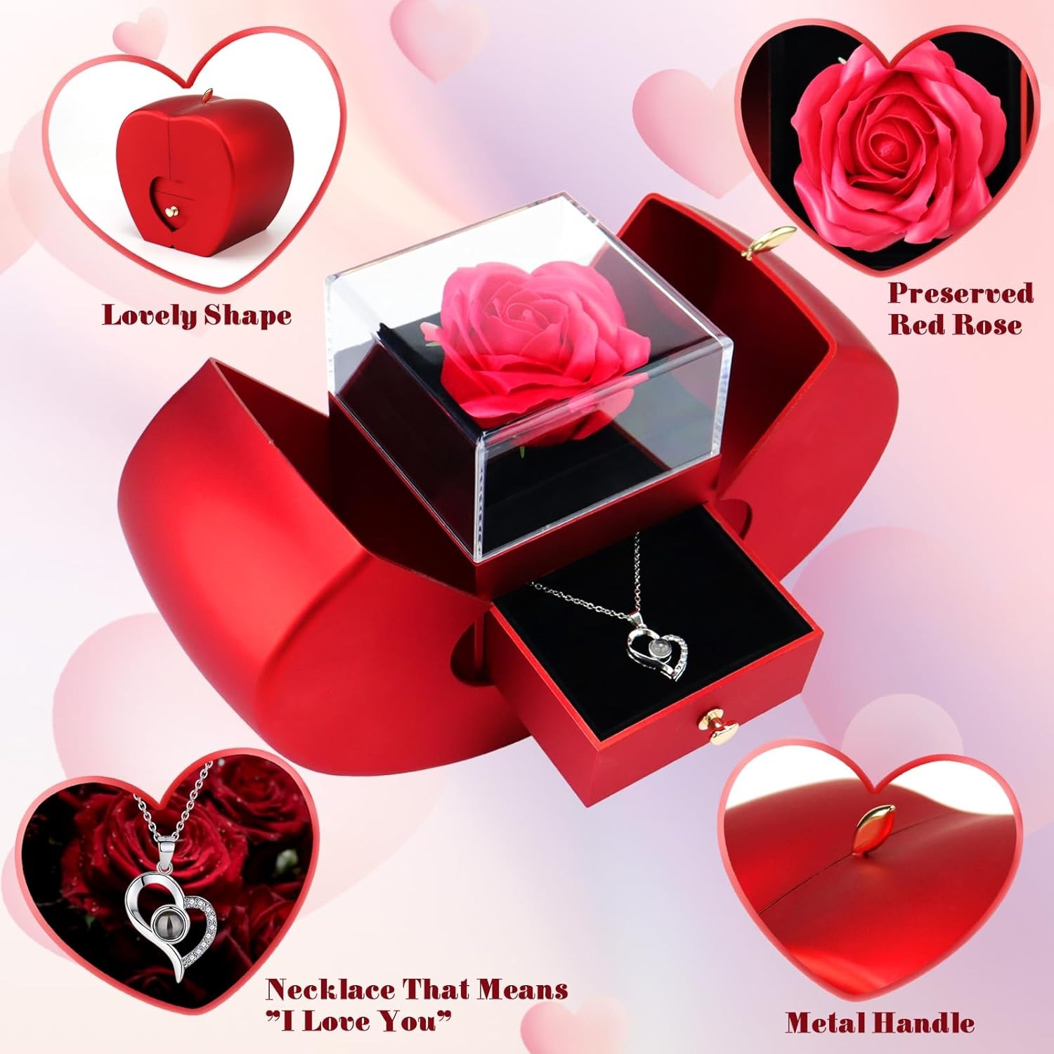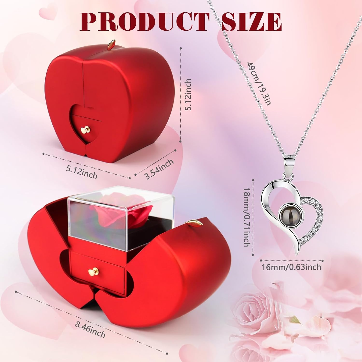 Exquisite Gift Set: Our gift box is exquisite in appearance, with an apple-shaped design, when you open this gift box, a beautiful eternal flower comes into view, and a heart-shaped necklace with "I love you" in 100 languages in the drawer under the gift box, a self-fillable greeting card. We provide gift bags, and there is no need for secondary packaging. You can give it directly as a gift to her.