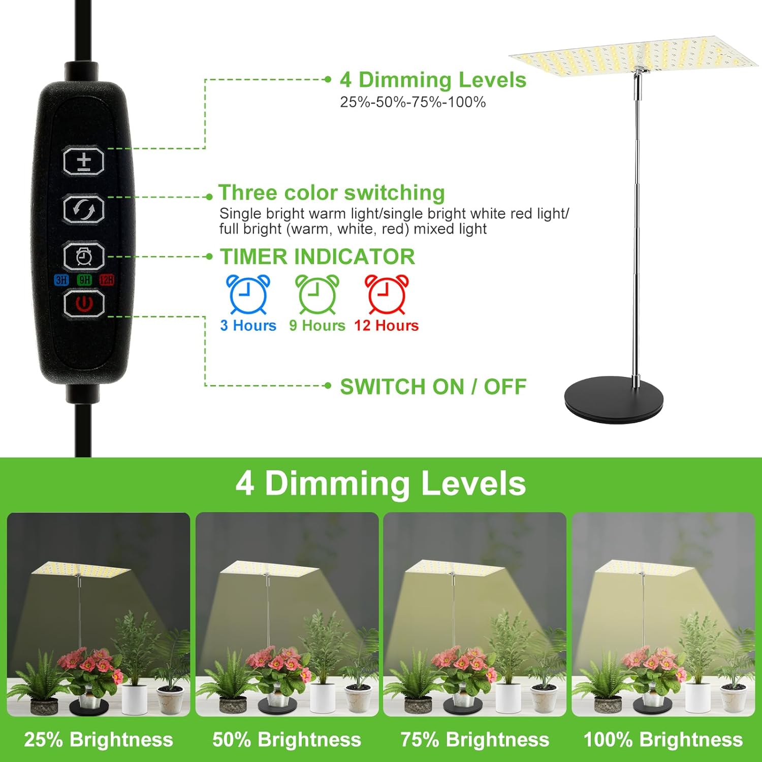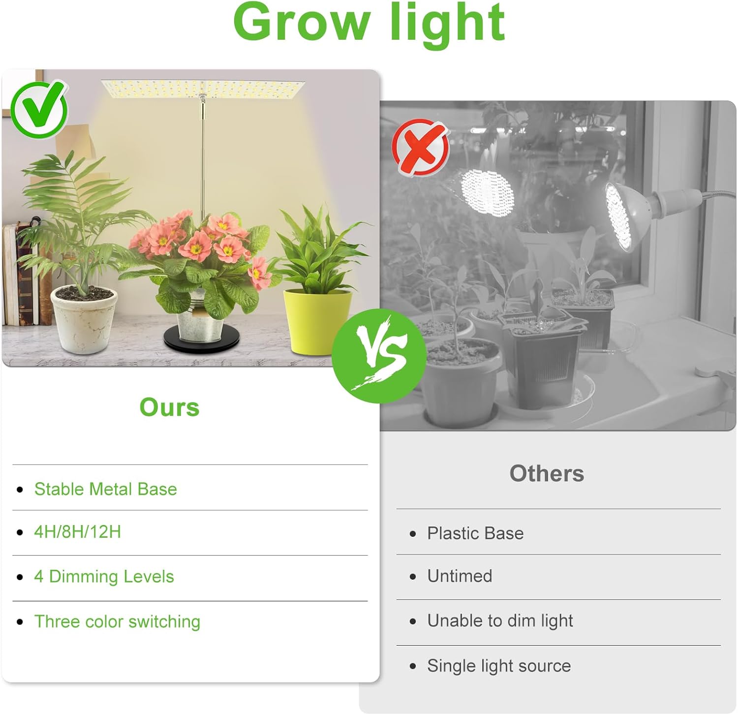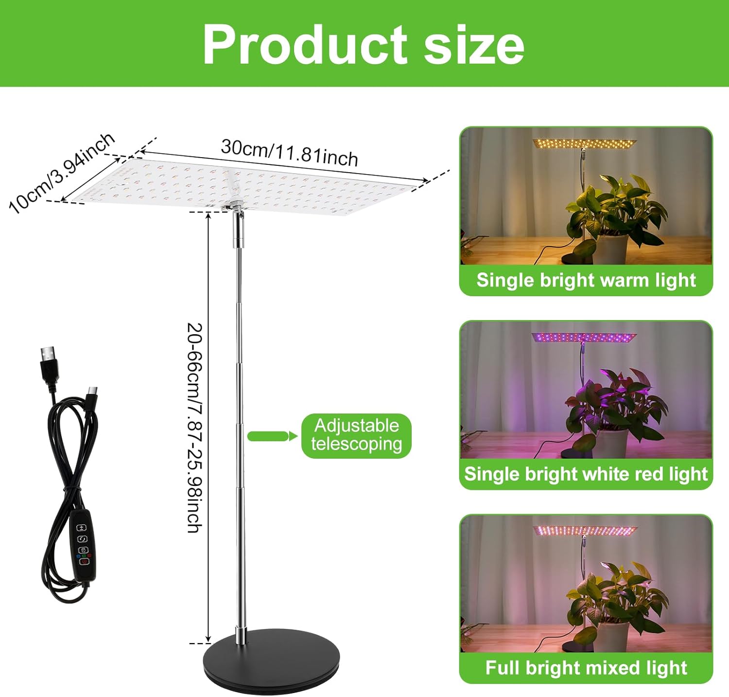 【2 Styles Grow Light for Choosing】There are 2 styles grow light for choosing: Style 01 inserting in the soil directly; Style 02 with base design. You can choose the one needed according to your needs. The grow light is equipped with muti-function switch, easy to use. And the grow light is compact and stylish, will not take up much space. Perfect for enhancing the indoor gardening and creating a great environment for your plants. 【Full Spectrum Grow Light】This grow light covers the full spectrum grow light required for plant growth, promoting photosynthesis, seedling germination, growth, and flowering, ensuring plants in healthy and vitality. And the LED Light beads adopts energy-saving LED technology, providing higher energy efficiency. Save energy cost and promote environmental sustainability 【Timer Function】This grow light is equipped with a built-in timer, allowing easily schedule your plant's lighting cycle. 3 preset timer options of 4/8/12 hours to for meeting specific needs of plants. Easy to set the timer, press the timer button once for 4 fours, twice for 8 hours and 3 times for 12 hours. After set the timer, it will turn on and turn off at the same time of the next day. 【Dimmable Brightness】This grow light features dimmable brightness with 4 adjustable levels: 25%, 50%, 75%, and 100%. Easy to adjust the brightness for an ideal lighting environment for the growth of plants, meeting different plant's lighting requirements. 【Height Adjustable】The grow light features a telescopic rod that has a height range of 7.8-26 in, easy to adjust the height for accommodating plants of different sizes and stages of growth. And the grow light is easy to use, style 01 for insert into the soil, greatly saves the space without using scenarios limitation. And the style 02 with bas can be easily place on desktop, windowsill or shelf. The light panel is 180°rotatable for precise lighting direction and even coverage.