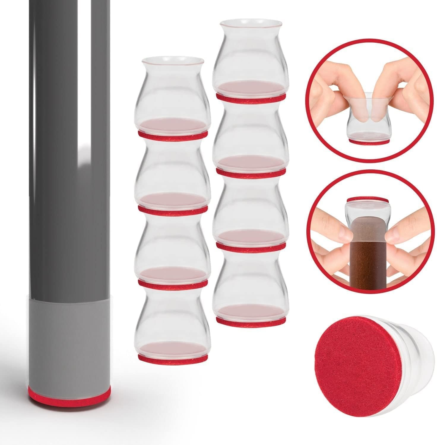 The friction created between your furniture legs and your floor or tiles creates damage that can be repaired with a lot of effort and a lot of money! The Silicone and Felt Floor - Furniture Protectors are the solution to keep your furniture legs and your floor intact. Place the protectors easily and quickly on chairs, tables, sofas, beds and desks and forget about cracks in tiles, scratches on floors and damaged furniture once and for all. The tight but flexible silicone from which the protectors are made is designed to hug and be placed effectively on any shape of your furniture legs. The red felt surface they have on the bottom is extremely resistant to daily use and the difficult conditions that develop from continuous use.