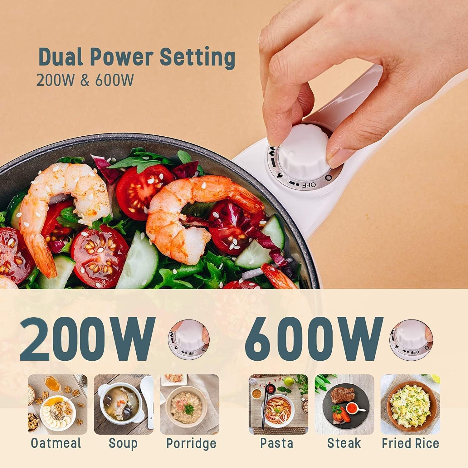 【Safe & Convenient To Use 】Our electric pan has over-heating protection and boil dry protection. 200W suitable for slow cooking, and 600W suitable for sauté, heating the food faster than other pot and cooking the food more delicious.
