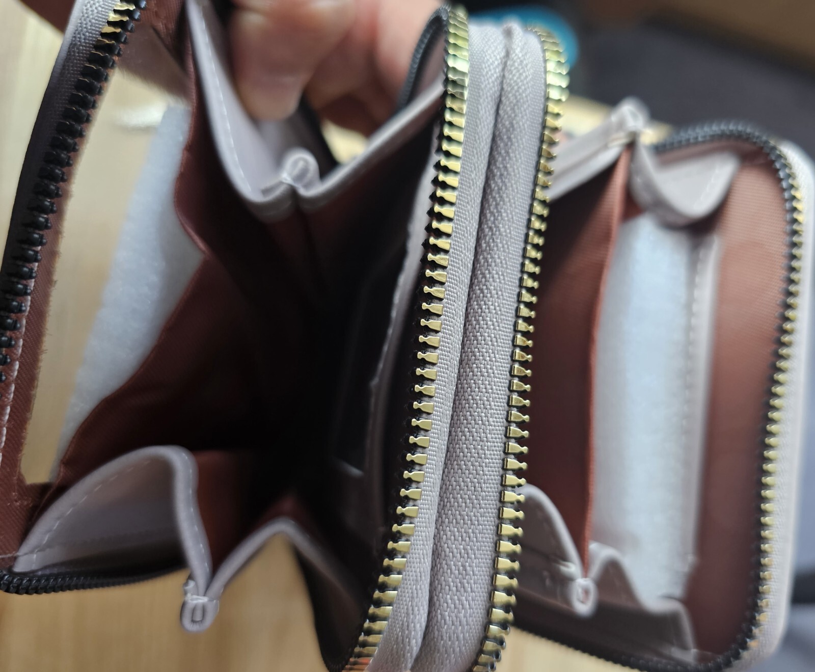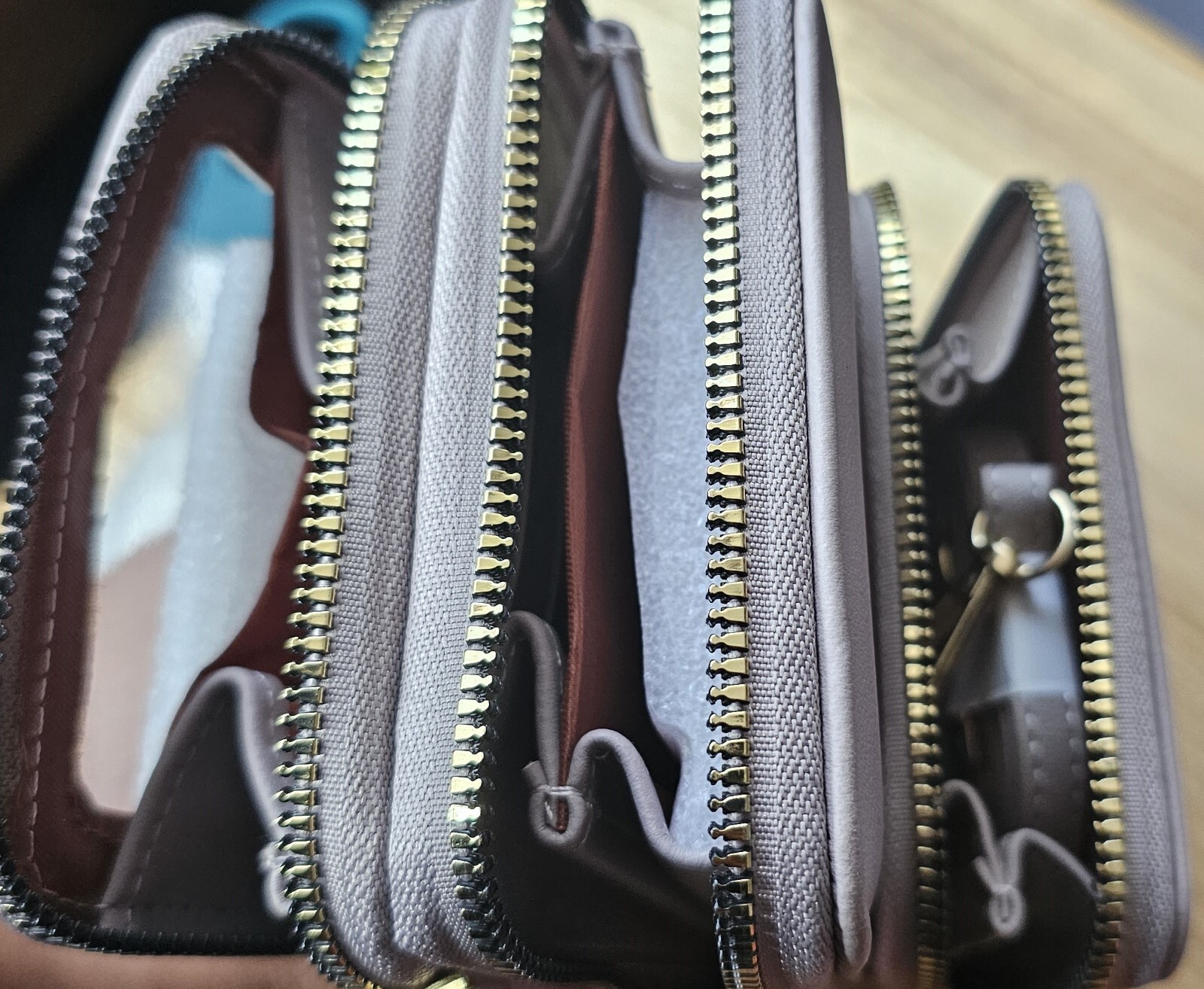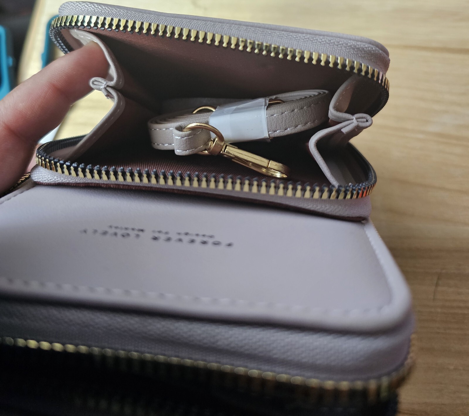 It has an outside pocket for your cell phone and the interior has room for credit cards and a zippered pouch in the middle.