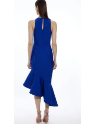 Step into elegance with the Seraphina Midi Dress, a perfect blend of sophistication and modern charm. Crafted in a stunning royal blue, this sleeveless dress features a timeless round neckline and a flattering mermaid/trumpet silhouette that hugs your curves before flowing into a dramatic high-low ruffled hem.