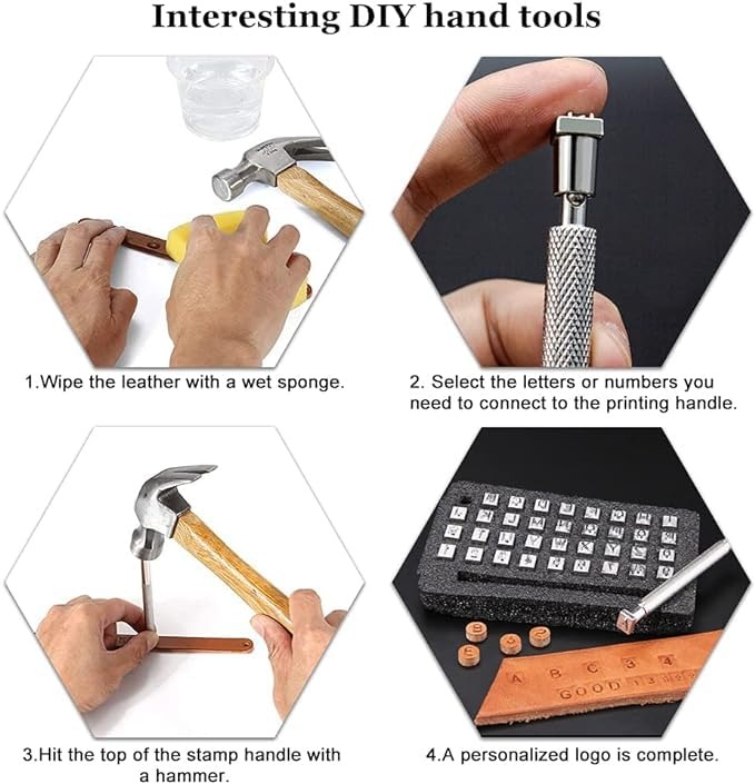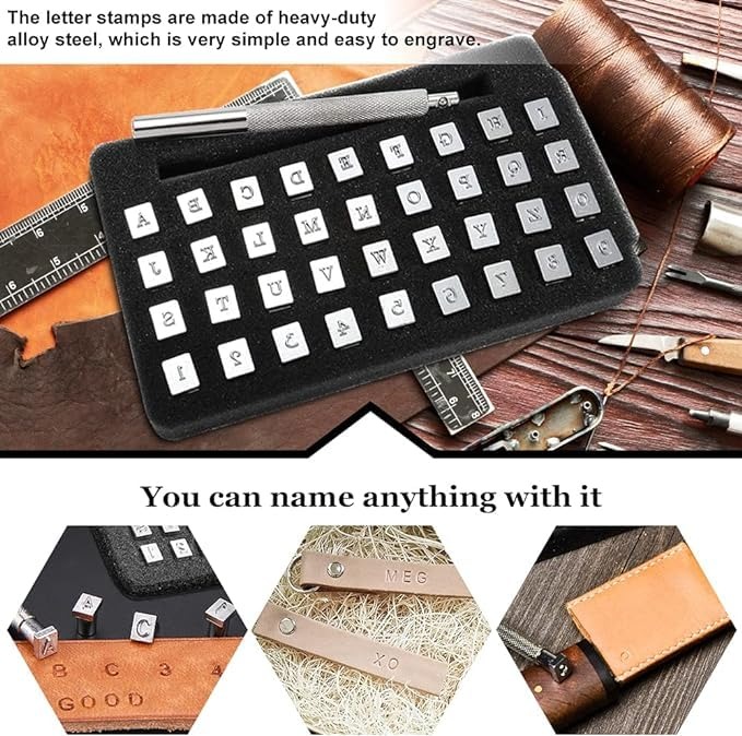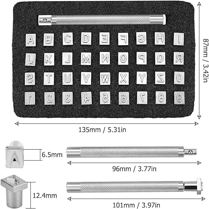 High-quality Hard Steel Material: These leather tooling stamps kits,number and letter stamp set material is heavy duty alloy steel metal , very strong for strikes ,will not easy broken,durable and long lasting,not easy rust and moving shape, you can make clear and accurate stamping results with it with less time and effort. Super Value 37 Leather Stamp Set: The set contains 36 models with different patterns, including 26 letter stamps, 10 digital stamps and 1 printing handle. The size of the stamp is 6.5 mm, the handle of the punching tool is comfortable grip and non-slip, with our these number letter punch set enough to meet your require for make your own words design on leather ,help to make your leather products more beautiful and personalized. Interesting DIY Leather Carving Tool: This leather seal kit is clearly carved and has great practicability. It is an ideal tool for DIY leather carving. You can use an ordinary small hammer to easily print letters and numbers on the leather, which is perfect for creating your own custom vintage signature/date/letter combination. Ideal for items such as leather wallets, belts, key rings or notebooks. Placed in a Fixed Position with Plastic Package: Each part of metal stamps letters these leather punch set is placed in a fixed position with plastic package ,not easy to lose,it is a very meaningful to send leather crafts with unique logos or humor funny words to your friends and family as gift ,this tool set is also suitable for send who like DIY making as gift. Easy to Use: Please use a wet sponge wet and clean the leather at begin , choose the letter or number you need , connect it with punching handle and put on correct position ,use the hammer to hit the end of the handle one character at a time until your favorite custom logo has been completed.Easy-To-Do stamps for beginner and professionals.(hammer not include ). Feature : 1, Made of alloy steel, durable in use. 2, The letters and numbers allow combined freely, very easy to diy your items. 3, Engrave letters and numbers to make your items and gifts special. 4, This stamping set is suitable for key chains and belts and other leather items like wallets, engraving names, birthdays, greetings and important anniversaries. 5, These leather letter punch applies for beginner and professions. Note : 1, Please remember wet and clean the leather with wet sponge at begin , because the wet effect is more clear than not wet effect .( see the picture of effect comparison.) 2, when you use hammer to hit the punching handle , please pay attention to control the power, avoid ghosting or surface damage. Specification: Material : alloy steel Handle length: 98mm/3.86inch Stamp size:10mmx8mm/0.39x0.31 inch (LxW) Letters and numbers height :6mm/0.24 inch Color: Silver Capital letter: A, B, C, D, E, F, G, H, I, J, K, L, M, N, O, P, Q, R, S, T, U, V, W, X, Y, Z Number: 0,1,2,3,4,5,6,7,8,9 Package include: 26 pcs A-Z alphabet letter stamp head 10 pcs 0-9 numbers stamp head 1 pc stamping punching handle