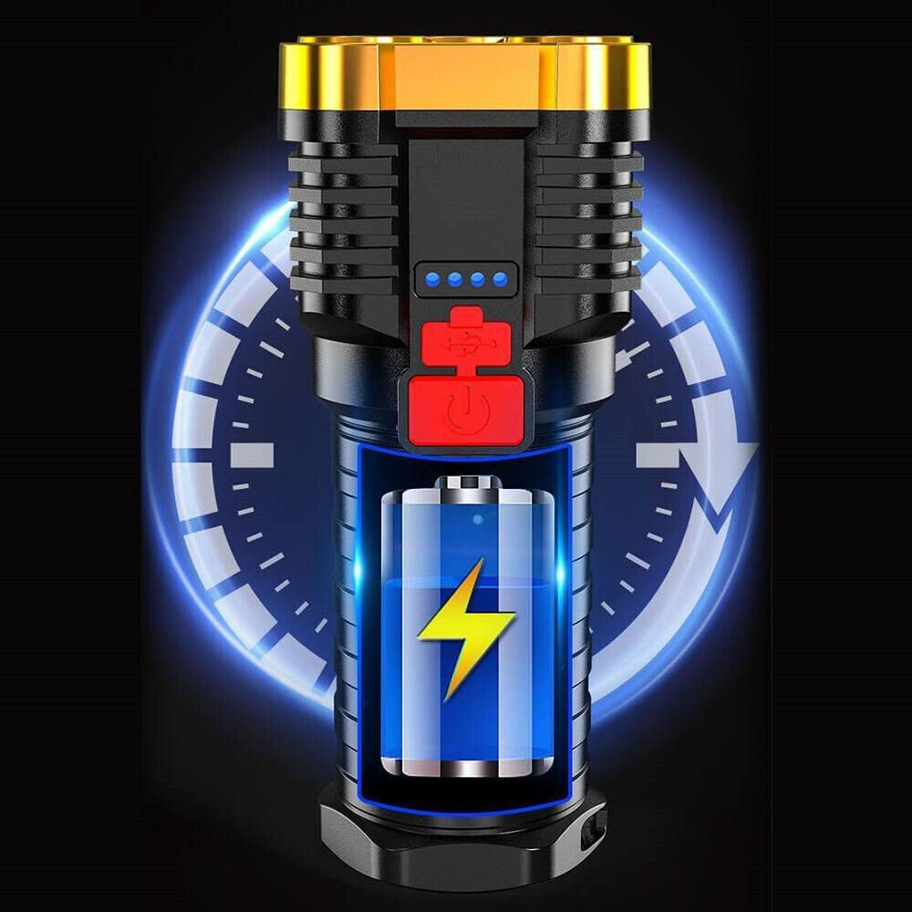 5COBTORCHGD Super Bright 1200000LM Torch Led Flashlight USB Rechargeable Tactical Side Lamp Features:*SUPER BRIGHT TORCH: This LED spotlight torch is high-intensity wick with more light; 30% brighter than other ordinary torches, easily light up an entire room or focus on objects.*WATERPROOF & MULTIPLE MODES: Our cob lanterns flashlight with waterproof design, can be used for rain days, no worries about rain and water and with 4 lighting modes (High/Low/Strobe/Side light) design, it can service as a front flashlight or turn on the side light as a table light.*USB RECHARGEABLE: Built-in rechargeable lithium battery, this USB rechargeable torch is convenient to be used with power bank, computer and other power devices, real-time power display (25%/50%/75%/100%) to keep track of battery power, and charging indicator function.*MULTIPLE APPLICATIONS: Our LED searchlight torch is perfect for outdoor camping, hiking, fishing, sailing, ride, power outages, emergencies, targeted searches or general household use, etc. to meet all your lighting needs.*PORTABLE & PEFECT GIFT: This portable led work light torch is handheld design, easy to carry with you as a backup, fit in your pocket, handbag, drawer, or car compartment. And it’s also a perfect gift ideal for families and friends.Specifications:Size: 150*60*60mmRange: 300-1000mBattery: Built-in 18650 batteryBattery life: 10-25 hoursMaterial: ABSWaterproof: IPX4Gear position: 4 gear dimmingPower supply: USB chargingColor: GoldPackage:1x Torch1x Usb charging cable