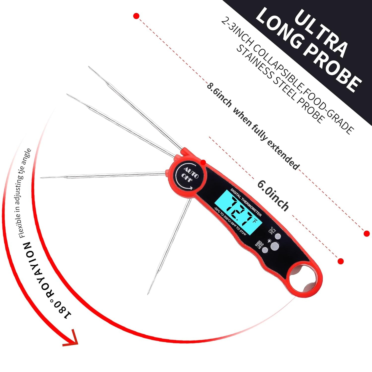【IPX7 Waterproof Stainless Steel Probe】The waterproof meat thermometer features IP67 waterproof rating for safe cleaning under running water. The 304 stainless steel probe is food grade corrosion resistant for lasting durability. Foldable probe design protects the sensor and enables compact storage in any kitchen drawer