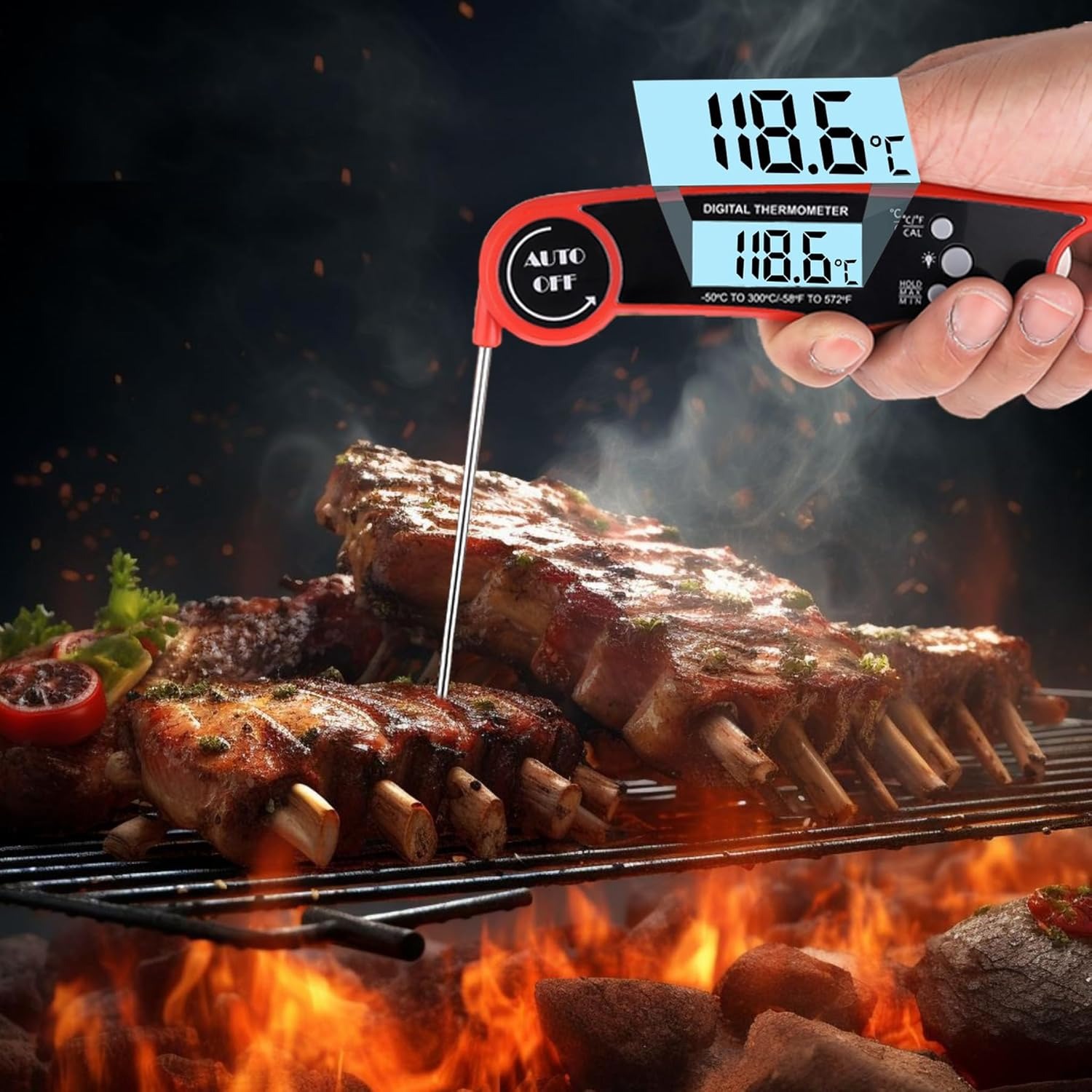 【Smart Auto On/Off Backlight Display】Designed for easy use, this cooking thermometer automatically powers on when unfolding the foldable long probe. The large backlit LCD screen provides clear readings in low light conditions or smoky BBQ environments. Featuring Celsius Fahrenheit switch and temperature hold function to lock readings away from heat