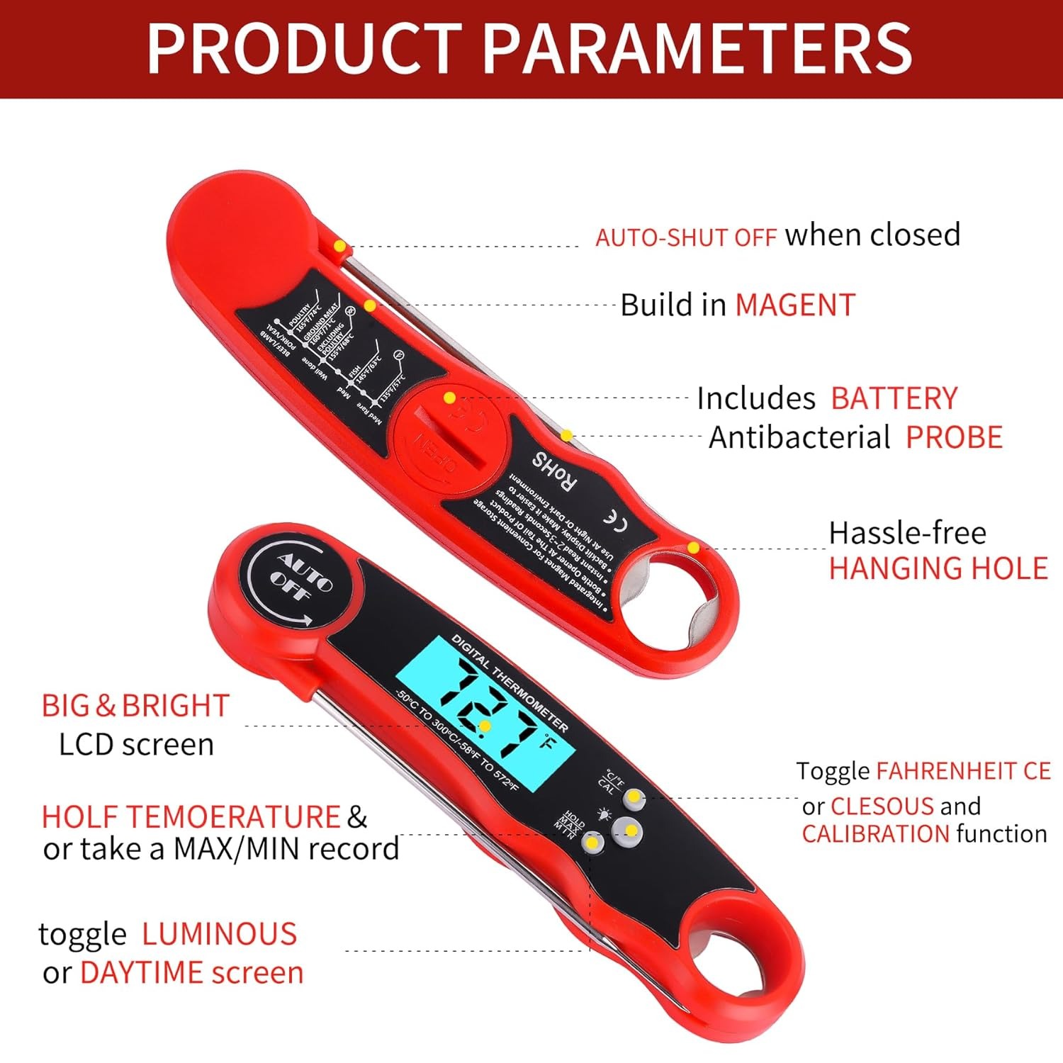 【Ultra Fast 3 Second Precision Reading】Instant read meat thermometer delivers accurate temperatures within 3 seconds with 0.8°F high precision. Featuring wide temperature range from -58°F to 572°F, this digital food thermometer is perfect for grilling steak, smoking turkey, deep frying, baking bread, making candy, and checking frozen meat or hot oil or hot oil