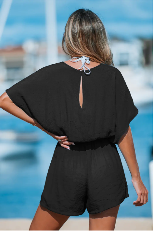 Black Plunging Tassel Tie Cover-Up Romper
