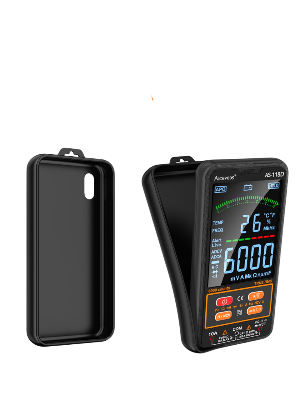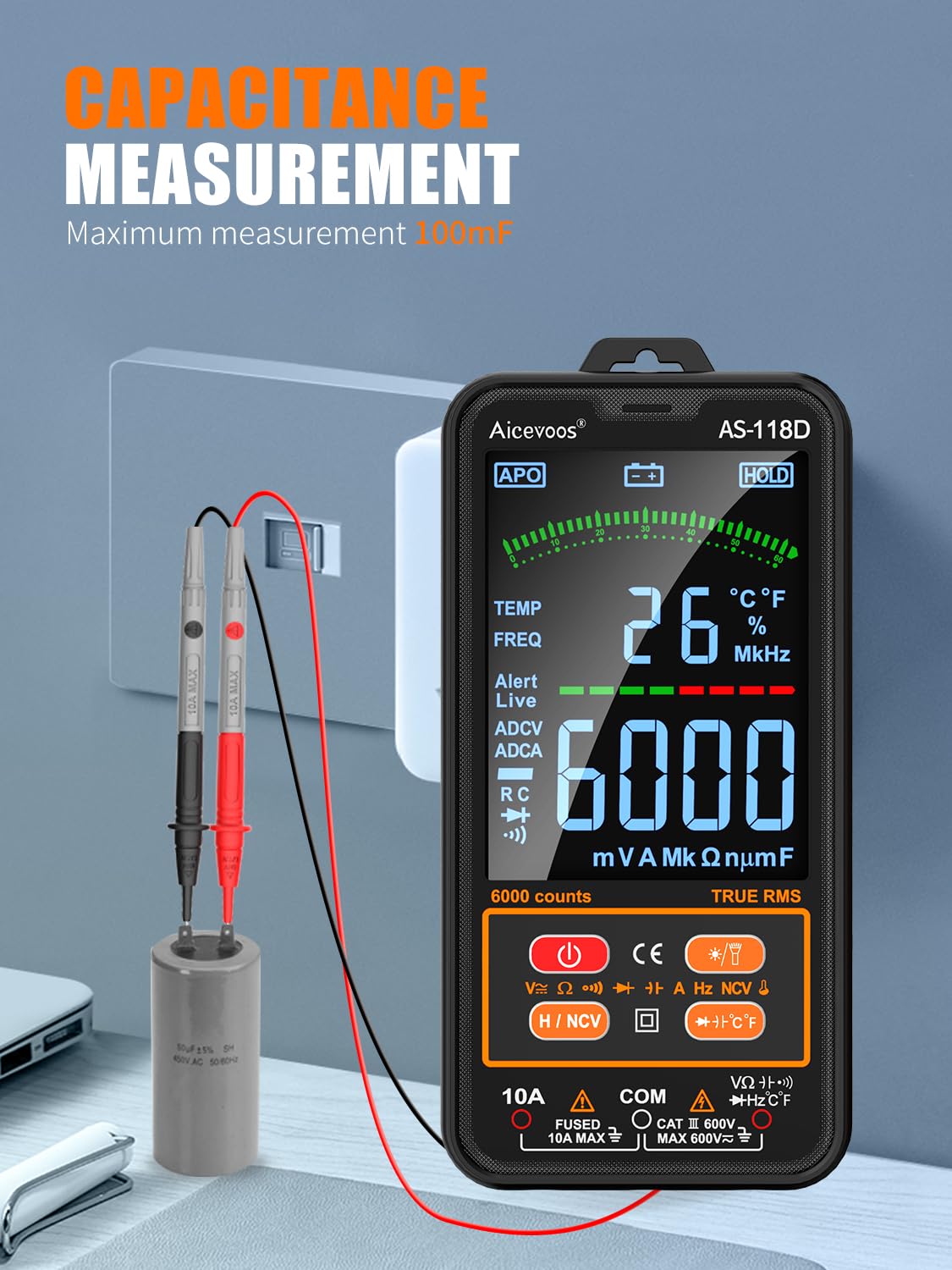 SMART MODE: Multimeter enters Smart Mode by default. In smart mode, the meter can automatically test voltage, resistance, capacitance and more. It recognizes what is being measured and selects the range with the best resolution, without you having to do anything extra! 4 INCH SCREEN - The multimeter is only 0.8 inches thick and can be taken anywhere. Stylish and stylish with a large color LCD screen and flashlight, it is easy to read even in low light places. TRUE RMS: The Aicevoos digital multimeter measures True RMS, which is used to accurately measure non-linear loads. Automatically shuts off after 10 minutes of working stop to reduce battery consumption. WIDE RANGE OF APPLICATIONS: AS-118D multimeter can accurately measure AC and DC voltage, resistance, continuity, AC and DC current, capacitance, frequency, diode, temperature, NCV and energized wire. It is the perfect tool to diagnose your car and solve household electrical problems.