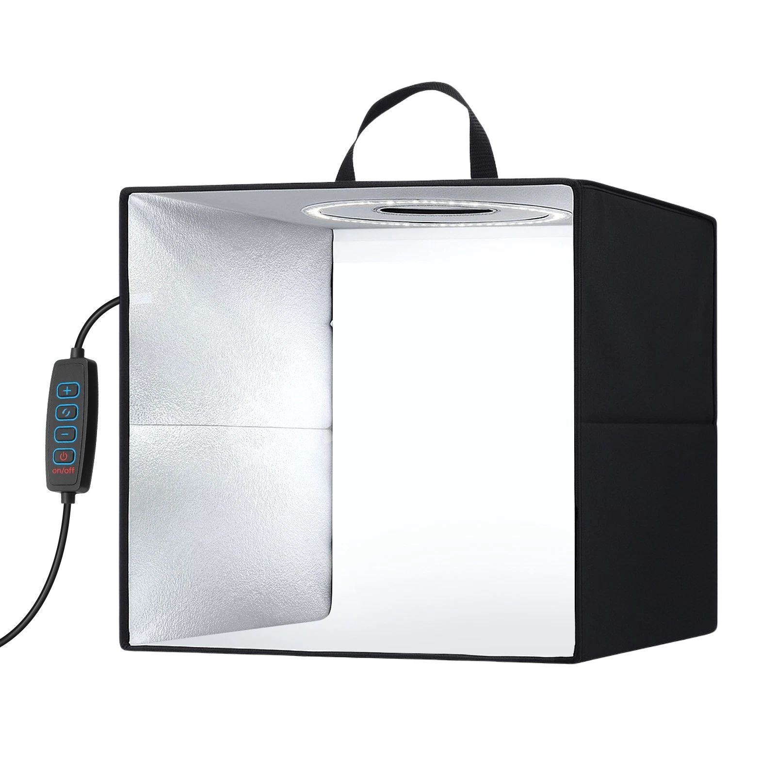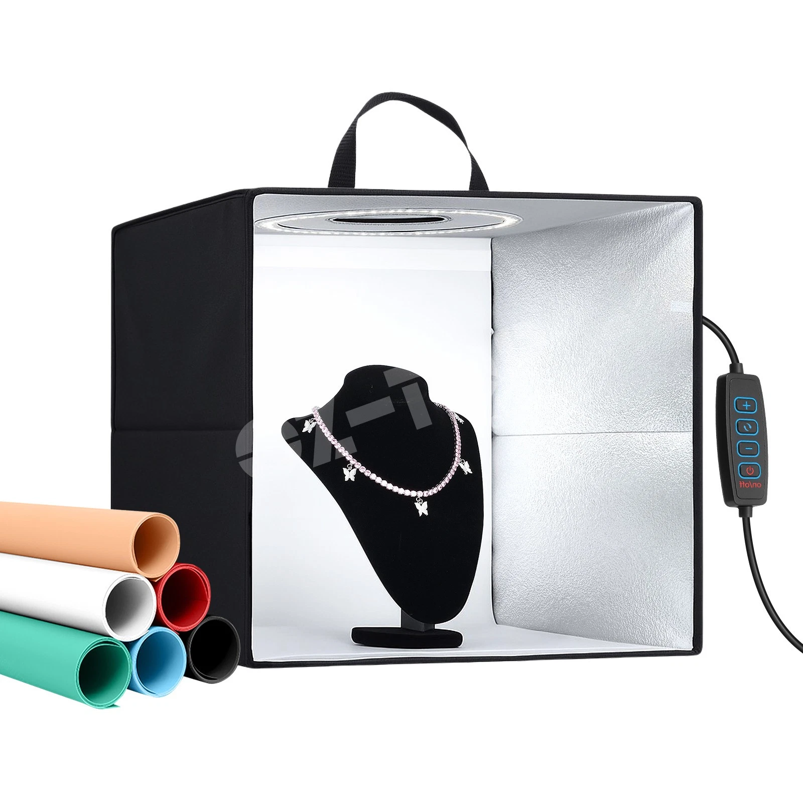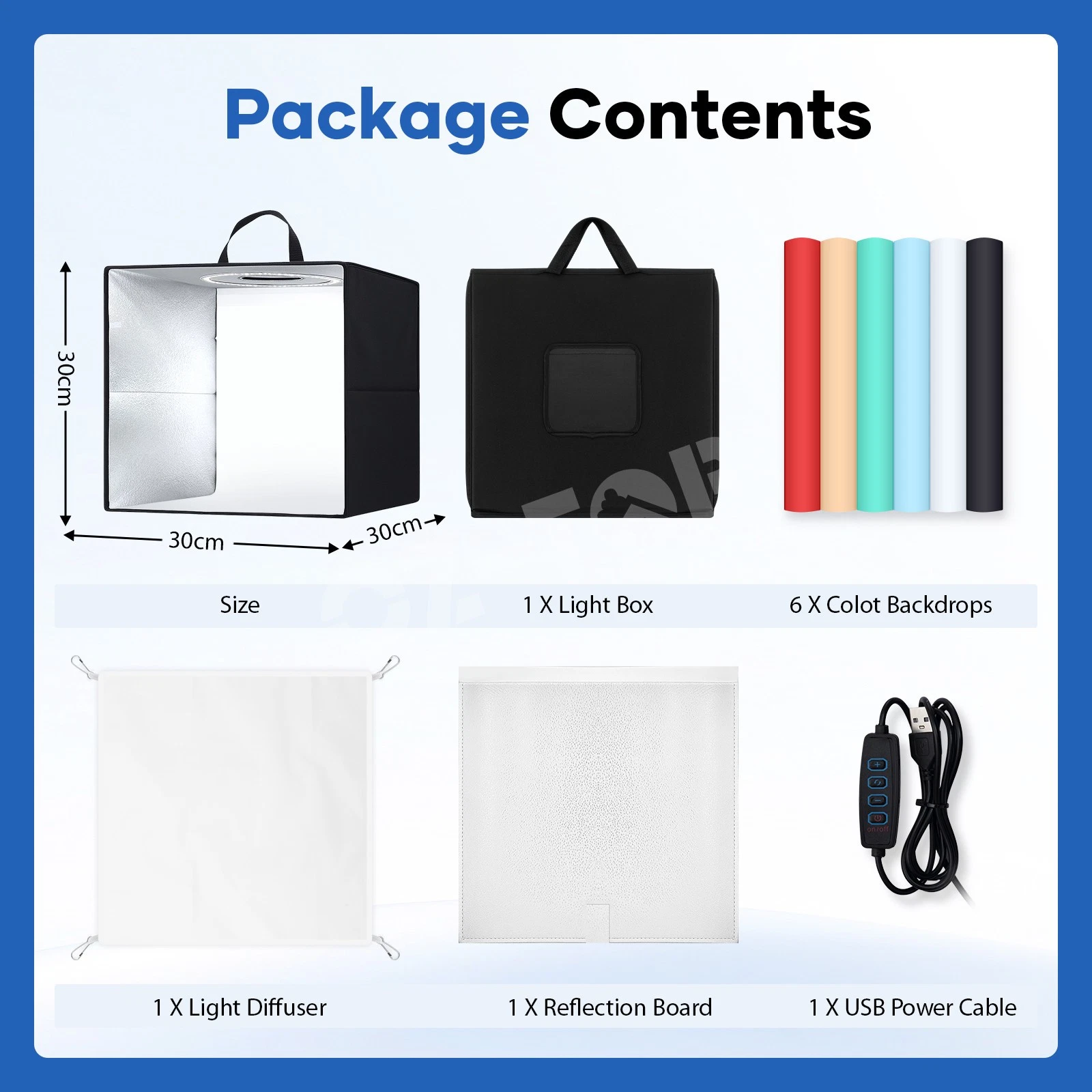 Features Compact for Small Items: This mini studio (30x30x30cm) is perfect for jewellery, watches, and other small items. Its size allows full light coverage, and a top opening offers flexible shooting angles. Upgraded LED Lights: Features 40 flicker-free, dimmable LEDs for bright, even lighting, making it perfect for high-quality photos, even with a phone. Adjustable Brightness & Colour: Choose from 10 brightness levels (1%–100%) and three colour modes, including white, warm, and softvia an easy three-button control. Foldable & USB-Powered: Quick to assemble with hook-and-loop design, folds to paper size for easy transport. USB-powered for use with any 5V device. Complete Set with Support: Includes 6 backdrops (White, Black, Yellow, Red, Green, Blue) for different scenes. Backed by 24/7 customer service and a satisfaction guarantee. Specification Material Diffuser Cloth Overall Dimensions 30 x 30 x 30 cm Colour Black