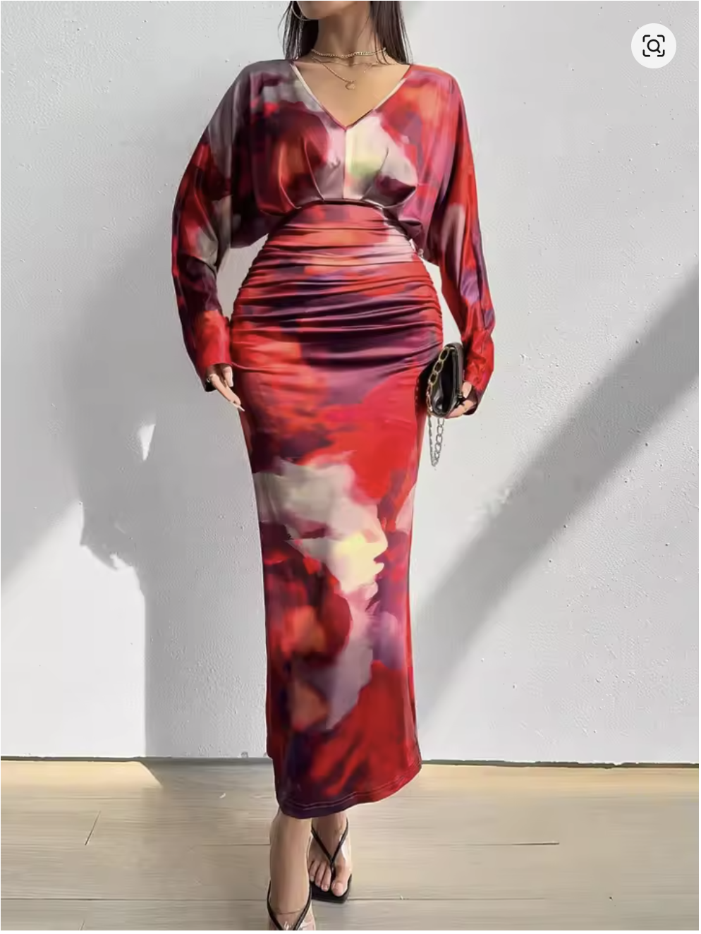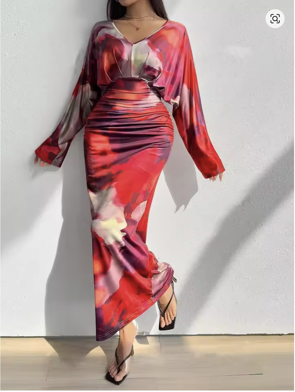 Red XL V-Neck Pleated Slim Fit Batsleeve Long Maxi Dress for Women Autumn Style