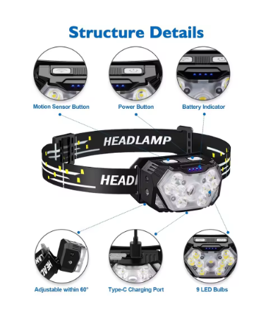 9 Led Strong Light Headlamp USB Rechageable Motion Sensor Headlight Portable Fishing Camping Outdoor Head Lamp Work FlashlightProduct Details-Item Type: Headlamps-Light Source:LED-Switch Mode: High/Middle/Low-Waterproof:Yes-Wattage:5W-Beam Angle:60°-Emitting Color: 1000mah Rechageable-Rechargeable-Sensor Mode Head Lamp-Lightweight Waterproof Head Lamp