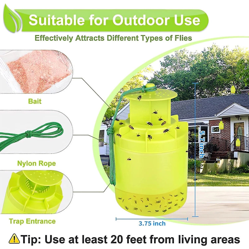 3. Effectively repel nasty flies: Reusable outdoor fly traps use bait that flies can't resist. This bait is invited to be made from natural ingredients, and is safe for children, pets, and wildlife and is environmentally friendly.