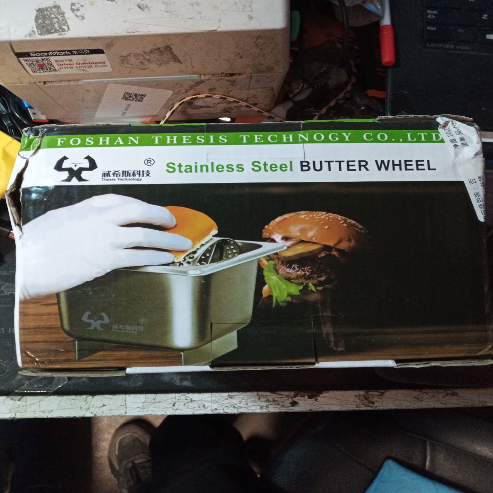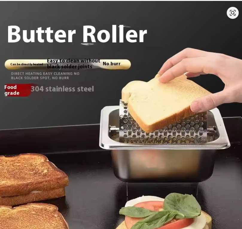 A 304 stainless steel butter roller designed for easy and even application of butter on burgers, sandwiches, or other street food items. Can be heated directly for convenient use in food stalls or restaurants.