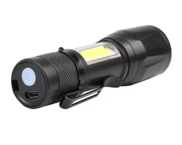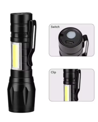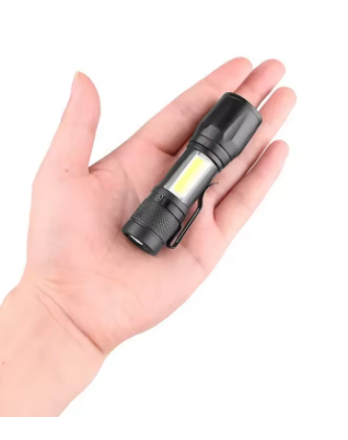 Compact and versatile mini LED flashlight featuring COB XPE lighting. USB rechargeable, zoomable focus, and comes with a pen clip—perfect for camping, outdoor adventures, or everyday use.