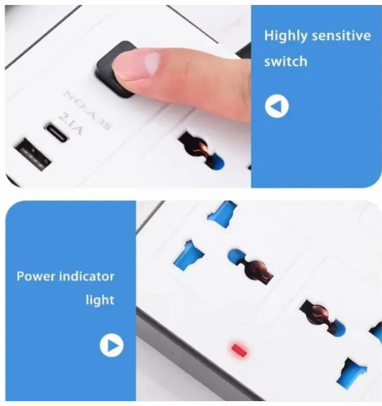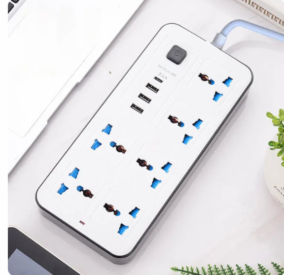 A versatile universal power strip with multiple plug types and USB-C ports. Ideal for safely powering devices with EU, US, and UK sockets, featuring a 2-meter extension cord.