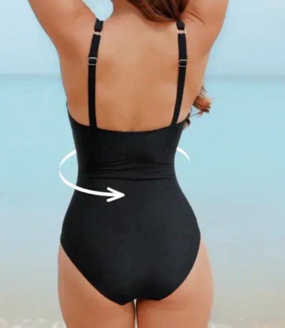 A sleek black one-piece swimsuit with ruched detailing and tummy control design, offering a flattering and comfortable fit for the beach or pool.