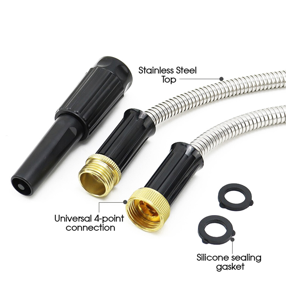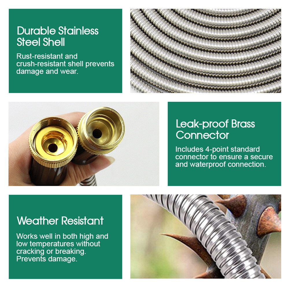 Crafted with a corrosion-resistant stainless steel outer shell and sealed inner tubing, it’s designed to withstand high pressure, heat, cold, and daily use. Whether you're watering the garden, washing the car, or hosing down patios and pets, this hose delivers a steady, tangle-free flow every time.