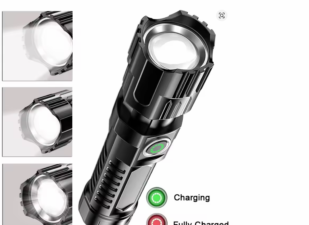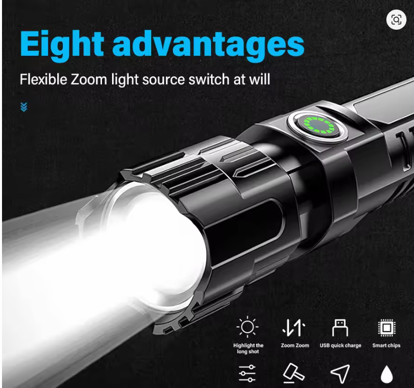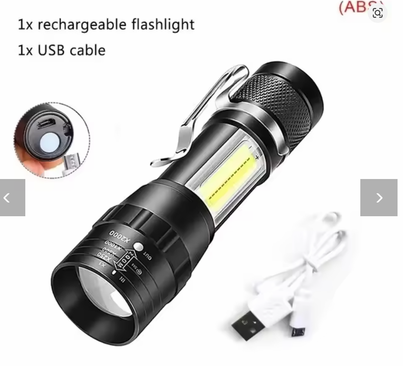 A versatile USB rechargeable LED flashlight with zoom function. Perfect for camping, night fishing, emergency situations, or outdoor adventures.