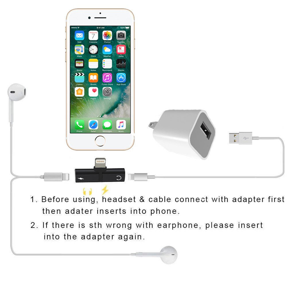 2 in1 lightning splitter adapter for iPhone has two ports, one port is for Charging, other is for music. Apple phones charger and headset adapter, perfectly iPhone compatible with iOS 9/10/11 version Ideal iPhone accessory