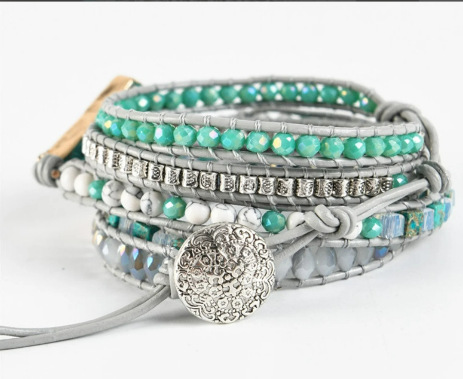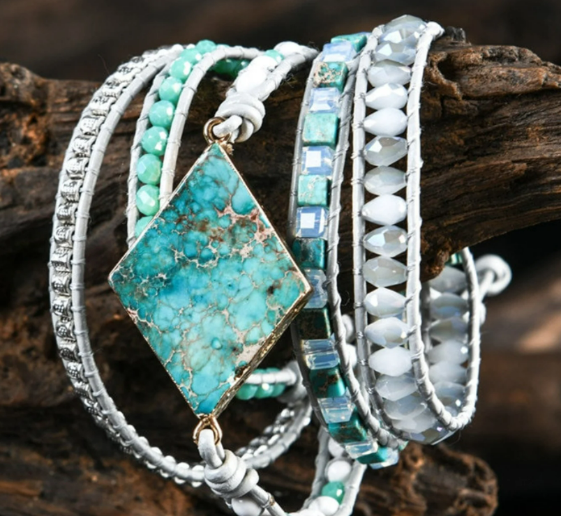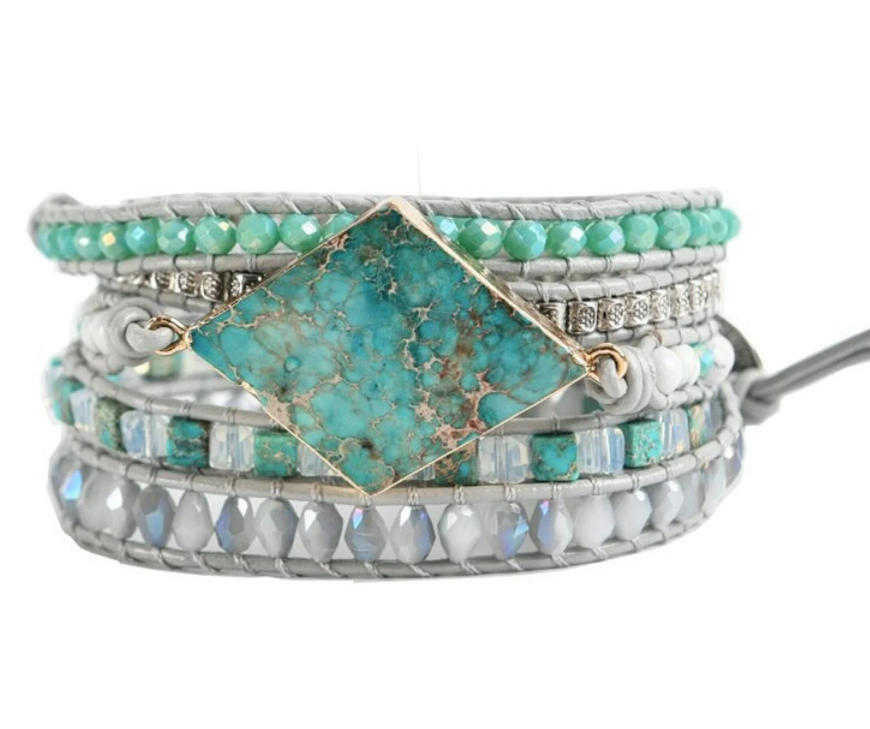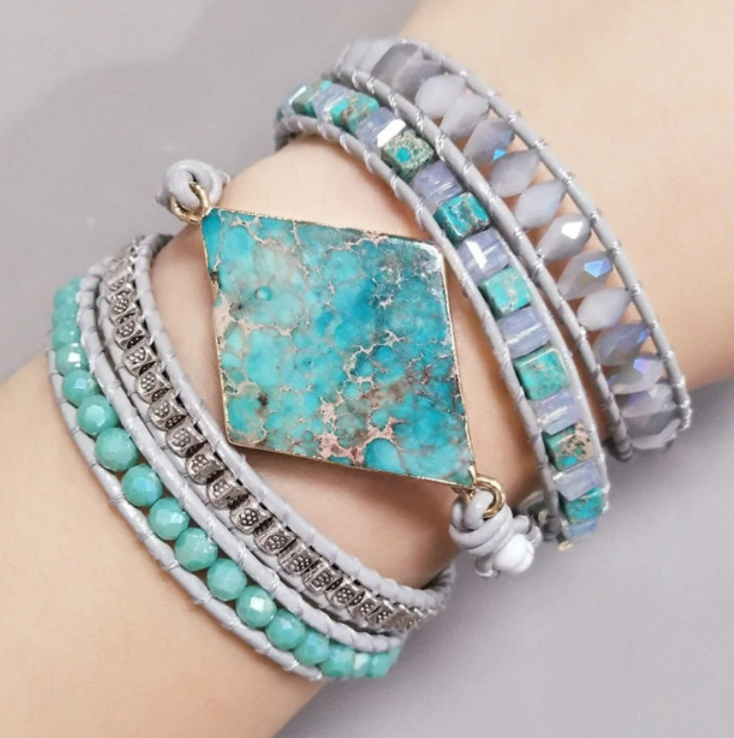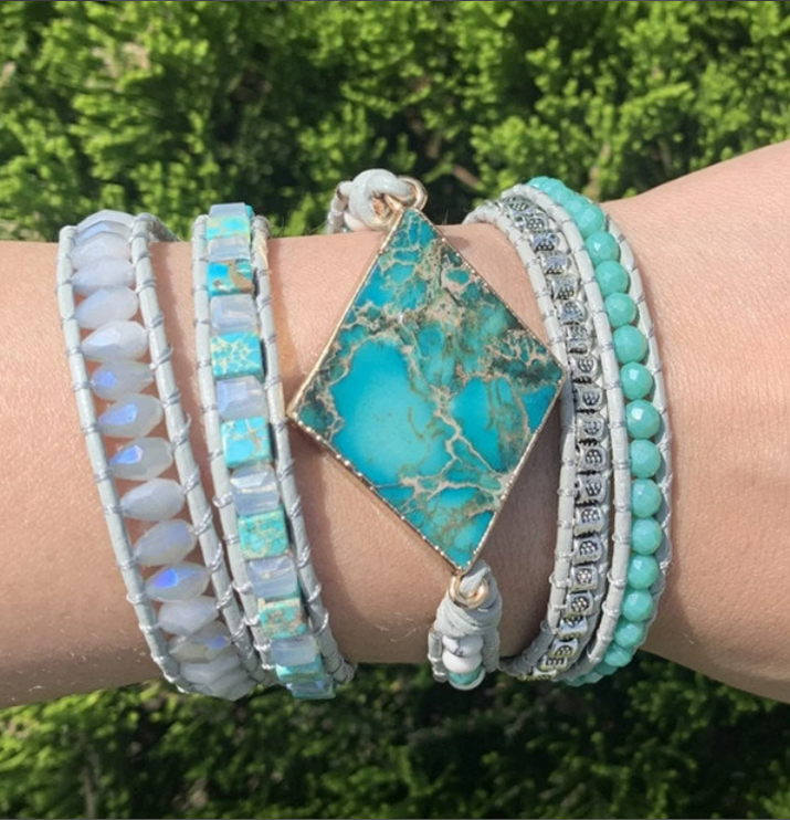 This bracelet is made from multi-color stone beads. The beads are sphere and have a diamond shape large one in the center. They are hand sewn onto waxed cotton cording.