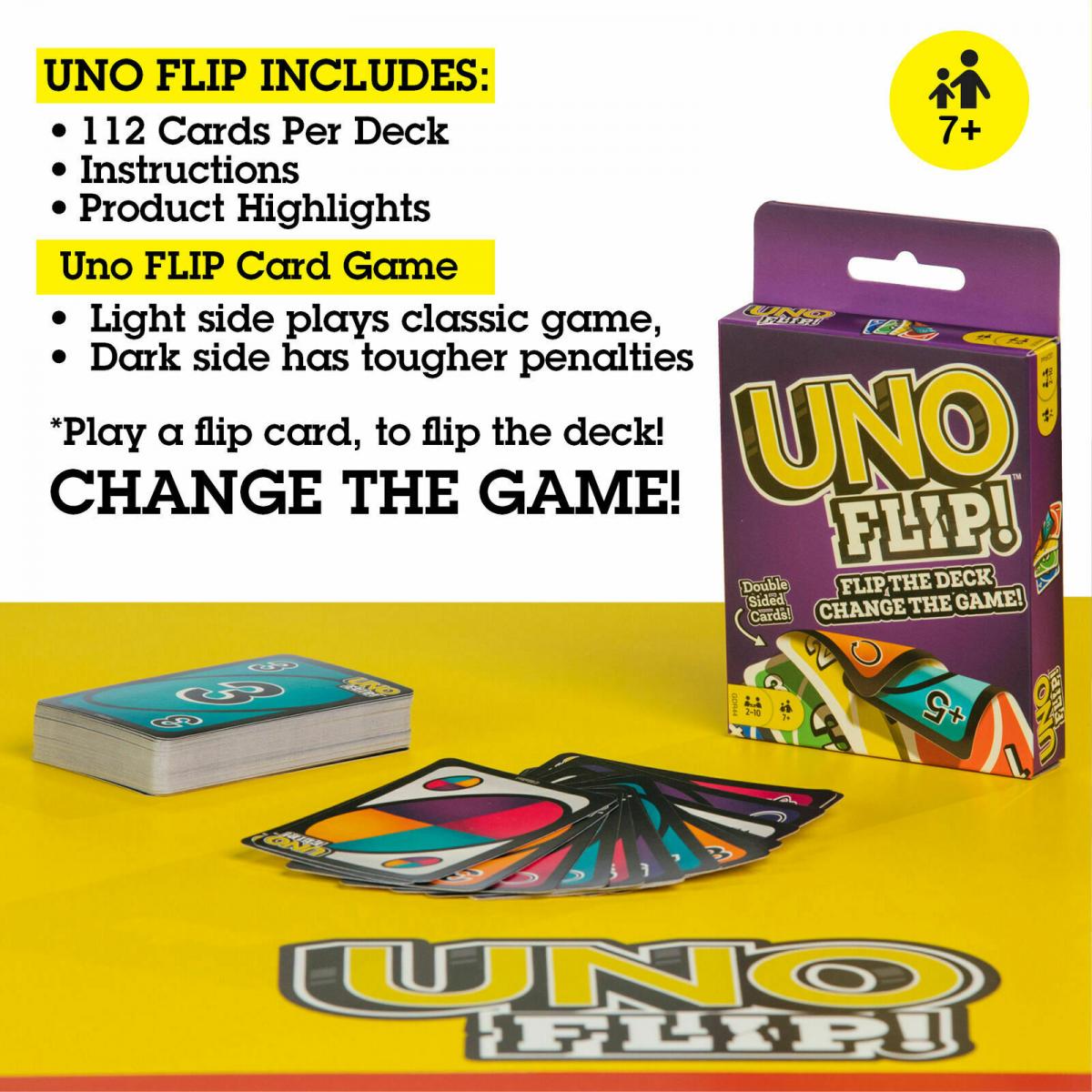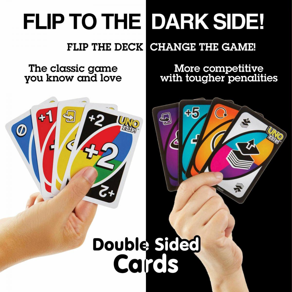 It's the matching game you know, plus exciting new twists - like a double sided deck and special FLIP card - that give classic gameplay a competitive edge. There is a "Light Side" which is the classic UNO deck, and there is a "Dark Side" has tougher penalties. This fun family card game is perfect for adults, teens and kids 7 years old and up.