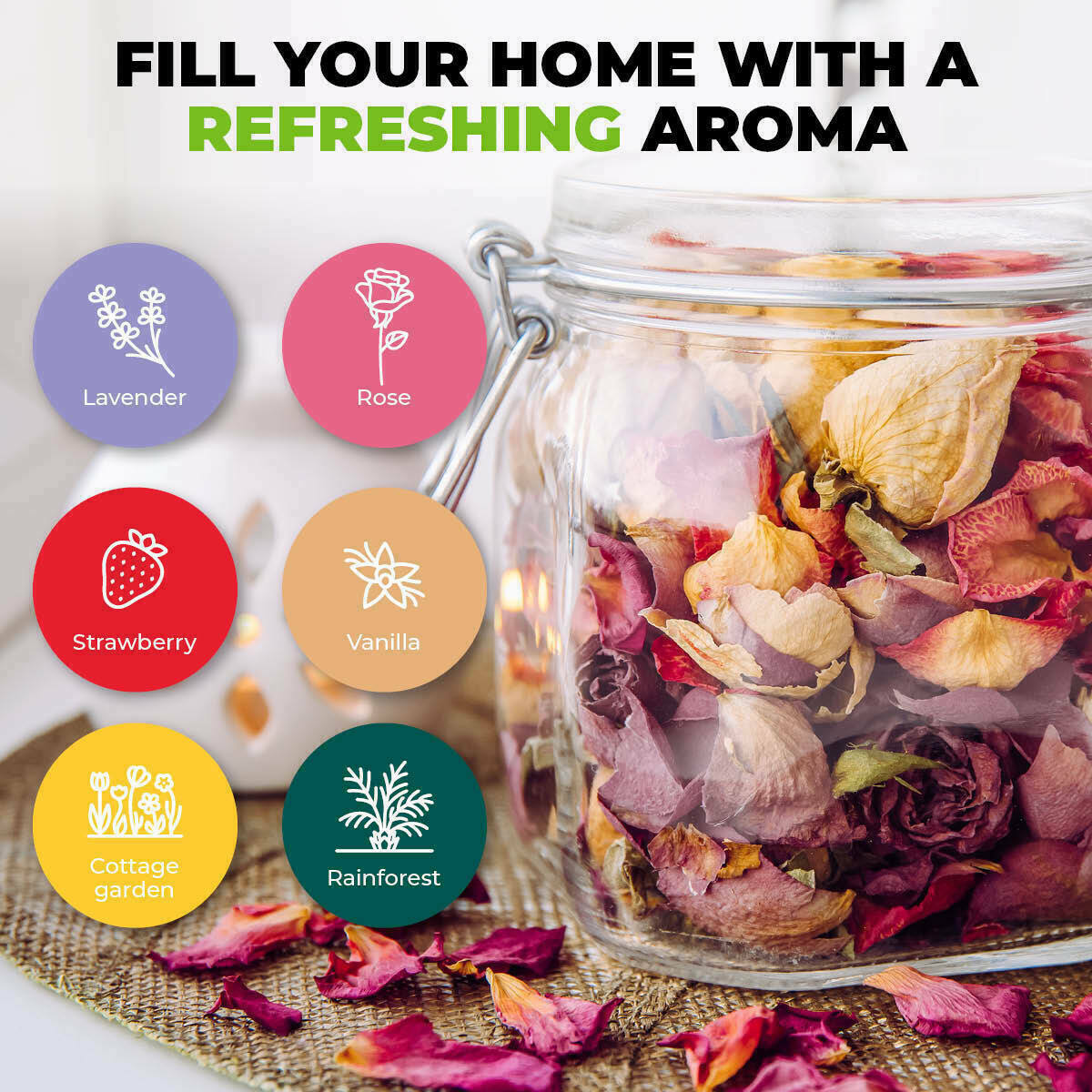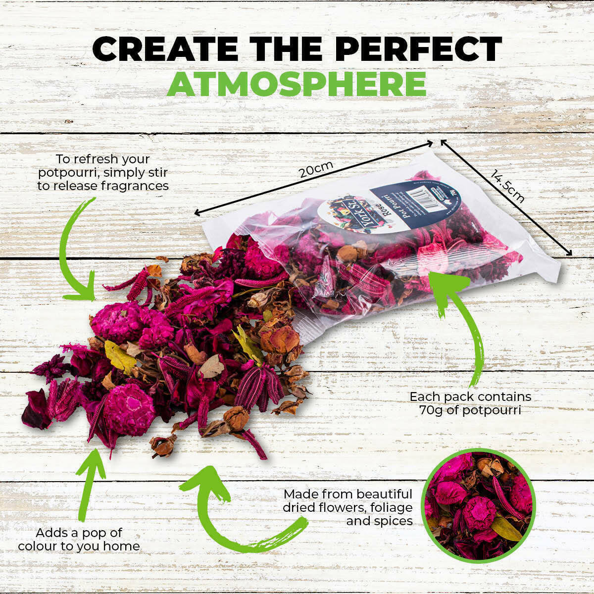 Home Master® These devinely scented Pot Pourri instantly refreshes any environment. Made from beautiful dried flowers, foliage and spices place them in bowls, or various decor pieces to add a pop of colour and aroma in any room, wardrobes, drawers and linen cupboards.