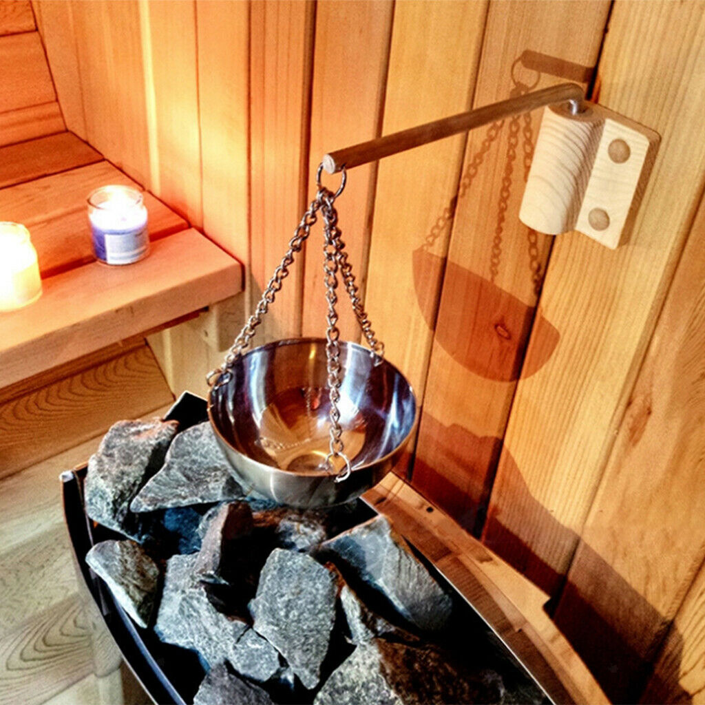 Beautiful and attractive sauna essential oil hanging bowl set, comes with hanging cup and mounting fixture.Easy to use, simple to hang above the sauna stove. When the temperature of the sauna heater is baked to a certain extent, the aromatherapy oil in the bowl plays a role, so that the whole house has a strong aroma, and you can also put salt crystal in the bowl. Mineral stone plays the role of mineral emission.Perfect for traditional or infrared saunas. Placed on top of the sauna heater with aromatherapy oil, the temperature is raised to produce aroma.Package includeds hanging cup with chain, extended metal arm, metal cylinder that can slide into wooden block, used for wall hanging wooden block.Material: 304 Stainless Steel and Wood. Size(Approx.): Outer diameter: 12cm/ 4.72inch, 20cm/ 7.87inch. Height: 6.5cm/ 2.56inch, 7cm/ 2.75inch. Thickness: bowl 1mm. Package Includes: 1 Piece Stainless steel Fragrance oil holder1 Piece Wooden base1 Piece Stainless steel chain