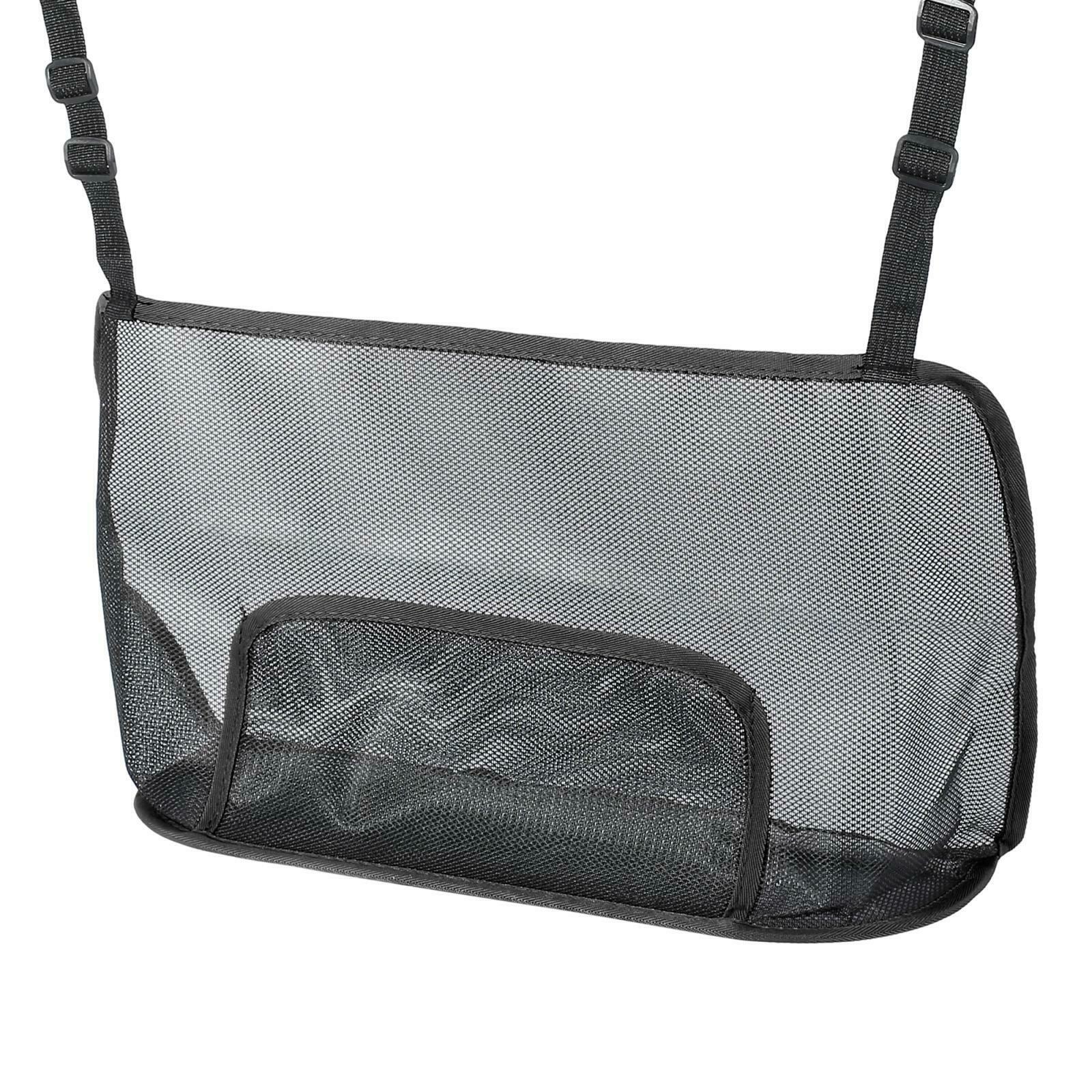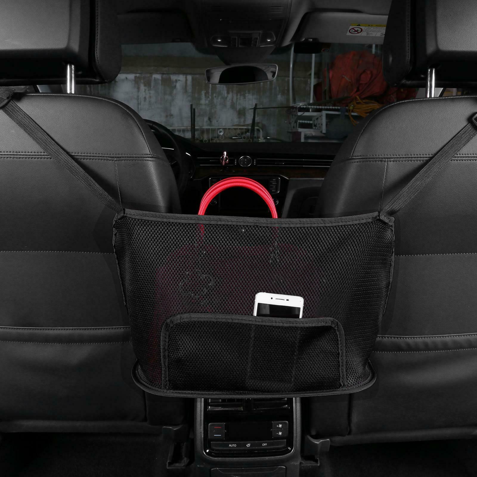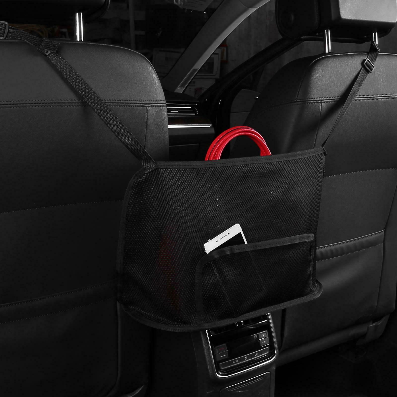 Feature: The Car Storage Bag is designed to help you store extra items like Bag, Documents, phone, or any valuable items that you need most to keep them organize and easy to reach. This Car Storage Bag is made from a flexible, durable material. The interior design is clean, accessible, and will not take space on your back passenger seat. The strap on the top is long enough to fit between the car seats and enough for adjustment. In addition to the storage function, it can also be used as an obstacle for pets to prevent pets from entering the front seat while driving, so that you can focus on driving and improve driving safety. It is a universal car seat mesh that fits most Off road, SUV UTV and other vehicles with headrest pole and consoles. Just fix the top button on the headrest rod without punching or pasting, which is very convenient. Specification: Color: Black Material: Polyester Fibre Package Include: 1 x Car Seat Back Storage Bag