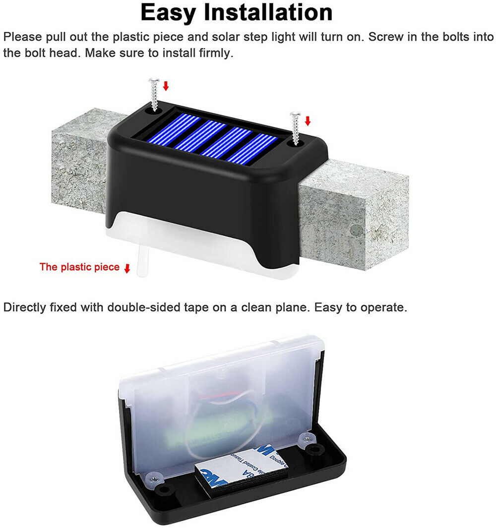 ✔【WIRELESS INSTALLATION AND EASY INSTALLATION】 Solar deck lights are very easy to installation, No need for messy wires, can be use with 2 screws (included) or double-side adhesive(included)easily mounted either vertically or flatly on plane.
