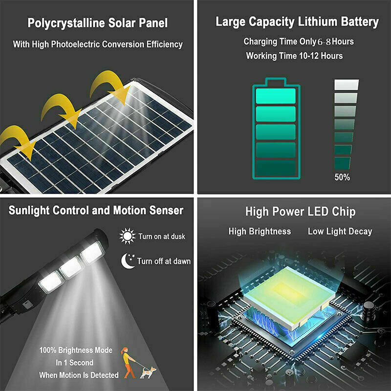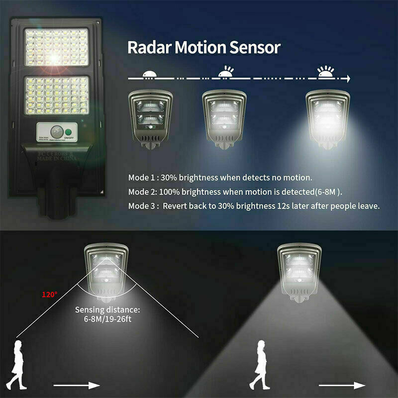 【 RADAR SENSOR 】This Solar Parking Lot Light goes on at dusk at 100% brightness and automatically closes at sunrise.When you passes by,it will be motion sensor full brightness light.After it,this solar street lamp will auto light up in 1/2 brightness.
