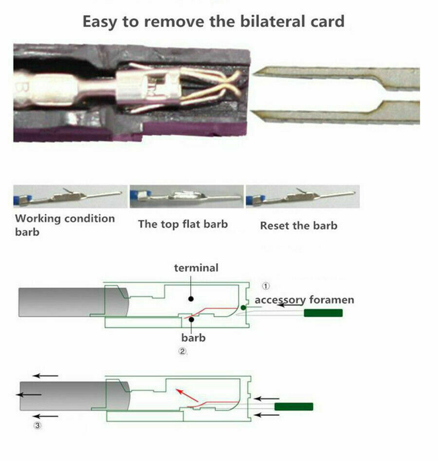 -Used to disassemble automotive wire terminals without damage.-Single Pin Diameter: 0.8/1.0/1.2/1.4/2.0mm single pin with one tip