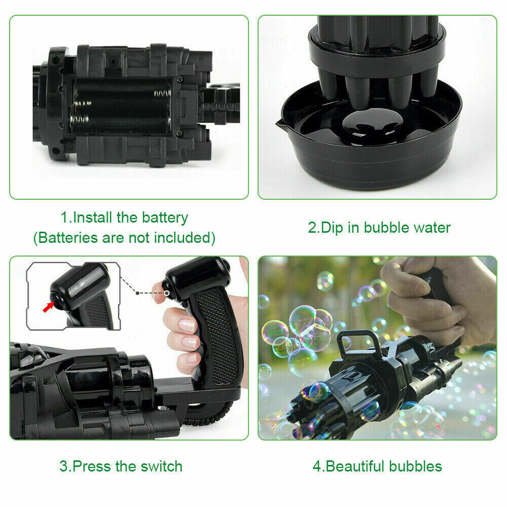 This product is a bubble maker for children. It produces bubbles non-stop and bring more fun for kids. Simple and easy for kids to operate. It is ideal for indoor or outdoor playing. Also great party favor or gift in birthday, Christmas, festival, etc.【Bubble, Bubble, and Bubble!】 8 bubble holes design! Cool golden Gatling look! As long as you press the button, a lot of bubbles will be ejected from 8 holes far more than other bubble guns. Bring you a different experience! Just put in 3 AA batteries (not included) 【Bubble Water Solution】 - Due to logistics problems, bubble liquid may need to be adjusted by yourself. Method:Two parts detergent, six parts water and 1-4 parts glycerin. Glycerin is a hygroscopic liquid. It forms a weak chemical bond with water, which can slow down the disappearance of bubbles. 【Wide Application】 - Our bubble machine is very suitable for indoor and outdoor activities, can also be used as party, birthday or anniversary gift. Whether you plan to host a party for your kids or celebrate their birthdays, our bubble guns are the highlight of party. 【Preferred Material】 - Made of the preferred ABS material, it is durable and has strong safety performance. Not cause harm to the human body. The bubble machine is suitable for children to play and entertain. 【2-in-1 Use】 - This bubble machine can be used as a summer fan with the bubble head removed. 2-in-1 use, make you happier with it! Feature: 100% brand new quality The eight holes make bubbles and the joy is constant Dip the bubble water, press the switch, the joy begins immediately Comfortable handheld shooting happiness Simulate Gatling machine gun handheld, eight holes produce more bubbles and more fun Happy childhood starts immediately Pour bubble water into the small plate, dip the bubble water and press the switch to start happy Color: Pink Size: 20cm x 9cm x 7cm Weight: 300g Package includes: 1*Bubble machine 1*bubble plate 1*Bubble solution