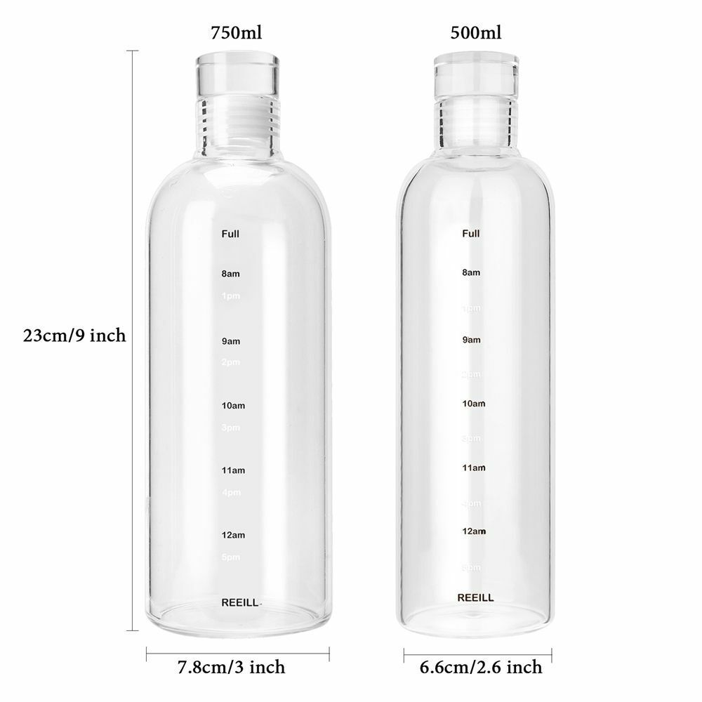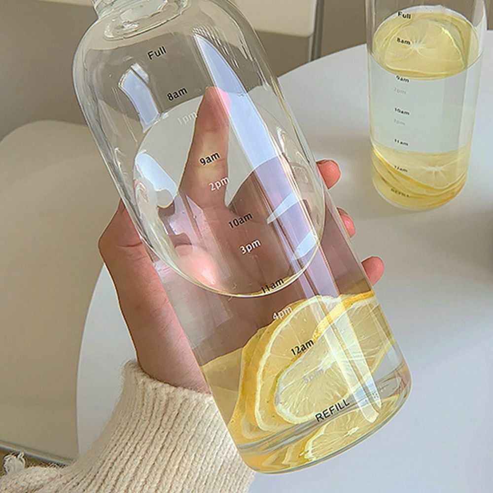 750ml Glass Water Bottle Clear w Time Marker Juice Milk Tea Cup Sealing Lid