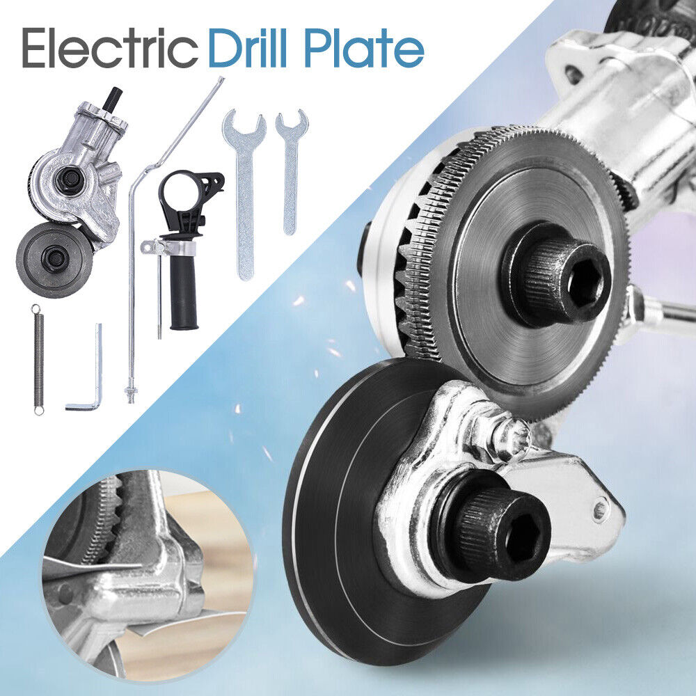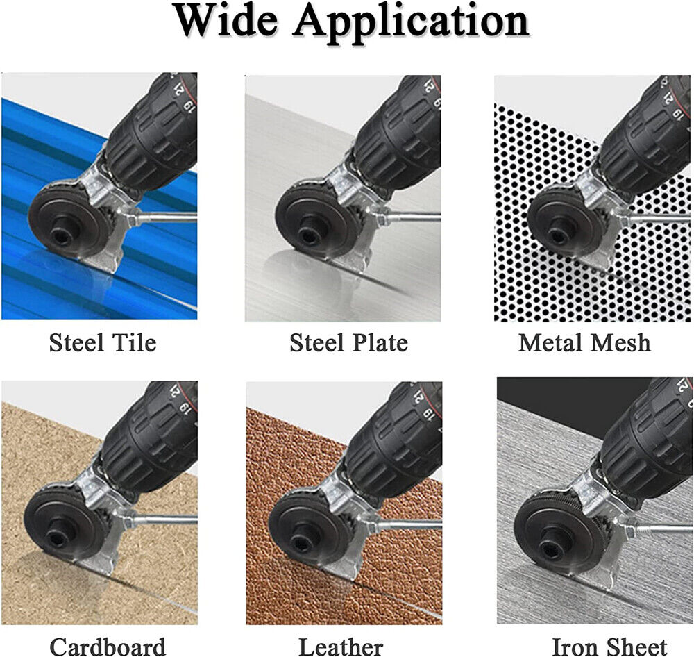 【Electric drill plate cutter】 This electric drill cutter is applicable to iron sheet, white iron sheet, copper, stee sheet, aluminum and other alloy materials. electric drill shells cannot cut metal plates of mixed, ribbed, deformed or welded shapes or non-metallic materials. If it is stuck and cannot cut forward, set the drill to reverse direction to exit automatically.