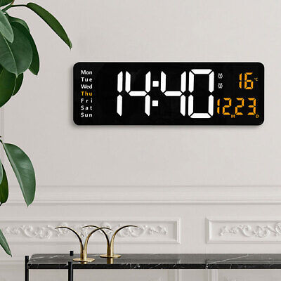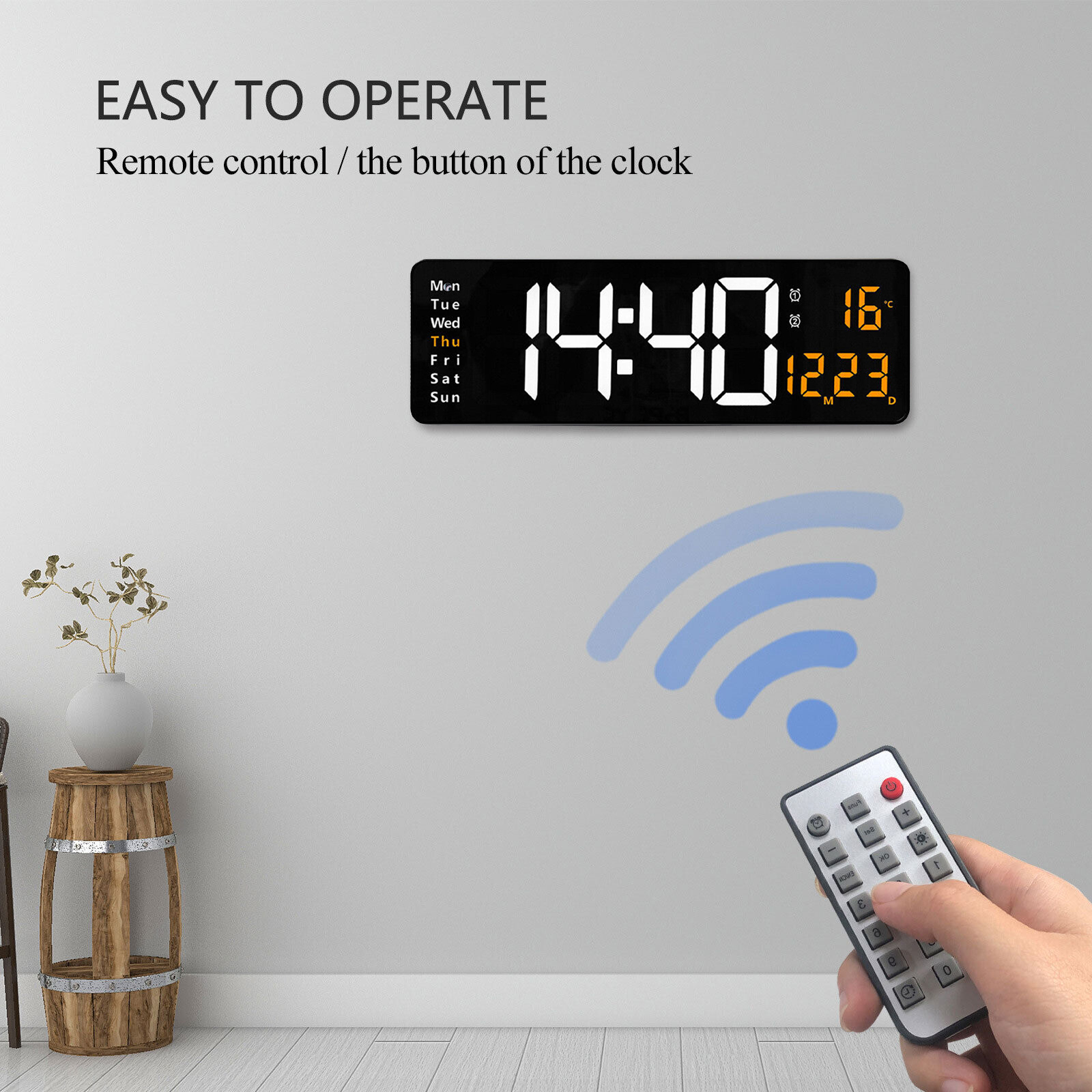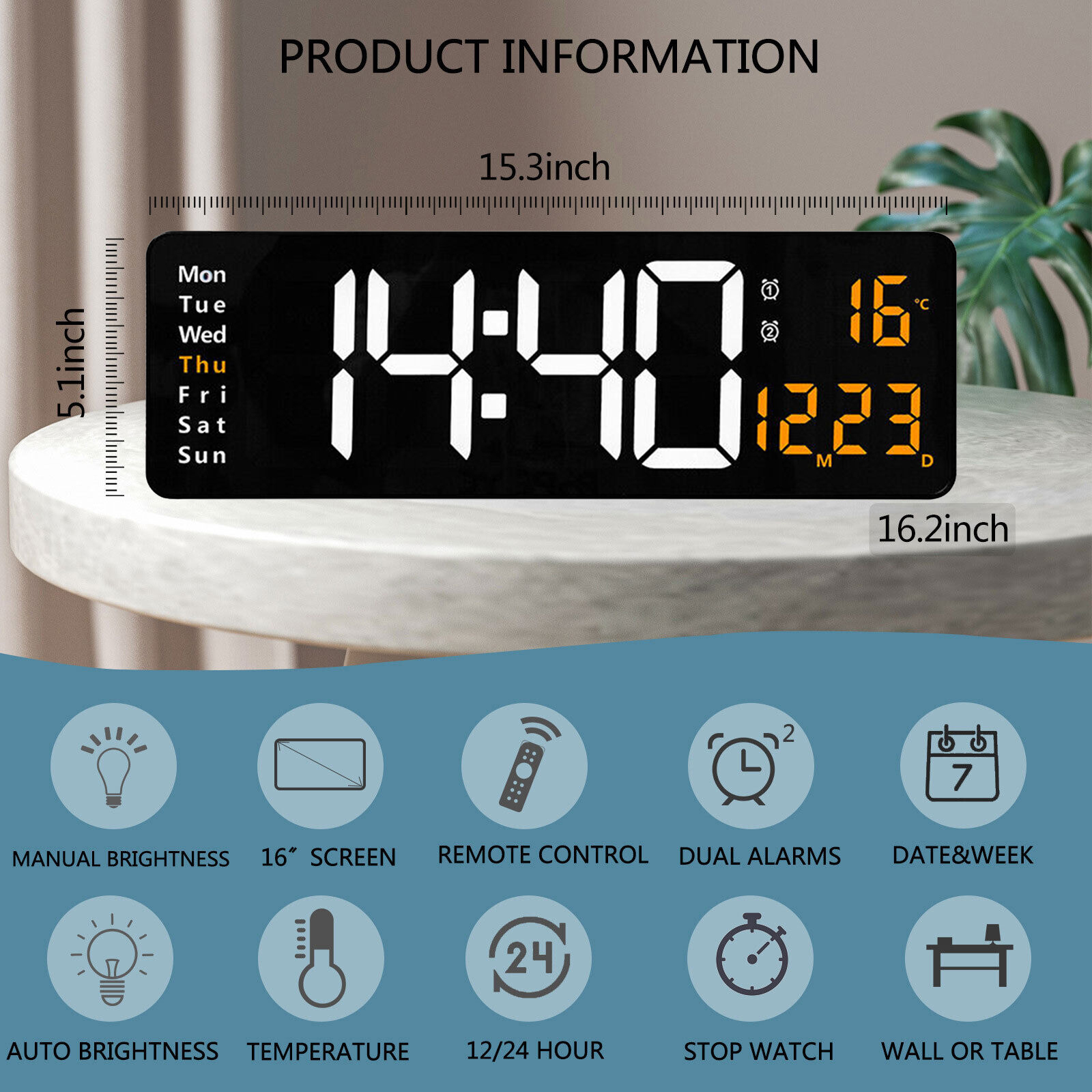 - 16" LED Digital Wall Clock: Our digital wall clock is 16" long and comes with large Arabic numerals, making it quite easy to view and read even from a distance. Time, date, day of the week and temperature are all displayed on the same screen. Two-color week display is more intuitive and clearer.