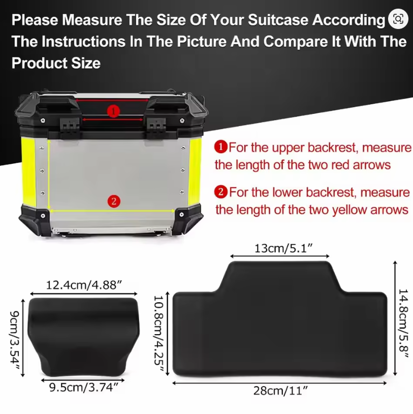 【Universal Compatibility】The backrest is universally suitable for aluminium motorbike rear cases with a capacity of more than 50 litres (check case dimensions before ordering).【Colour Selection】Two colours are available to choose from, black and brown (as shown in the illustration).【Waterproof Material】The outer layer is made of high-quality PU, waterproof and wear-resistant. The inner layer is filled with foam sponge, soft and comfortable.Easy to Install】The motorbike boot back padding has a double-sided adhesive tape on the back, just clean and dry the motorbike boot and stick the padding on the motorbike trunk surface. Do not expose to rain within 48 hours after installation.【Improves Comfort】The backrest of the top box adopts a split upper and lower design, which can effectively improve the riding comfort of rear passengers and reduce riding fatigue. Note: 1.We strongly suggest comparing the posted picture to your faulty/old unit! Please kindly check your motorcycle's model and confirm this item is suitable for it before ordering. 2.The product does not contain installation instructions. If you have any questions about that, we kindly recommend you go to the nearby mechanic to ask for professional instructions. 3.Installation: Easy to install, assemble and remove with great convenience, direct replacement. Highly recommended installation by professional. 4.Color Difference: Due to the light and resolutions setting difference, the item's color may be slightly different from the pictures. 5.Please allow slight dimension difference due to different manual measurement.