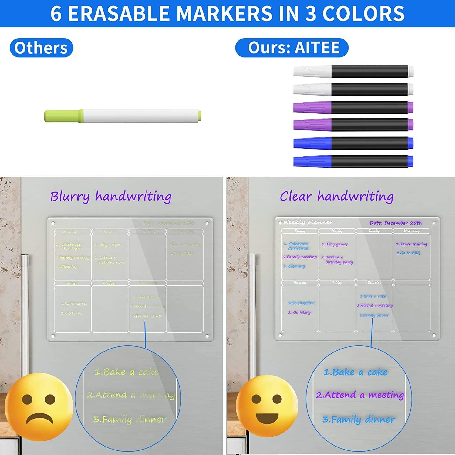 Ultra Clear Marker & Easy Erase: This dry erase board calendar set includes 6 markers in 3 different colors of blue, purple and white, the markers write very smoothly, the writing is clear, easy to clean, and the fast-drying ink prevents fading and smudging. And the mark is easy to erase without leaving marks or ghosting, you just need to wipe it off with a blackboard eraser or a damp cloth to reuse it again.