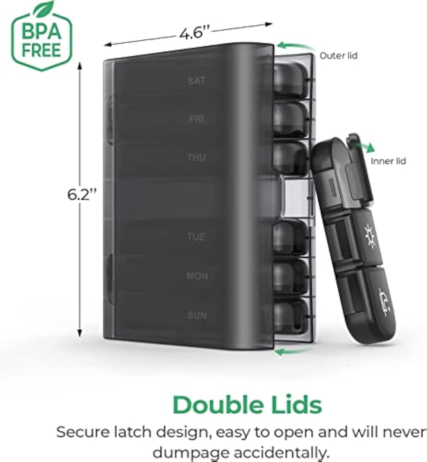 5. Track Your Medication: Pill container (morning, noon and night) sort your pills 3 times a day; larger black shell can accommodate 7 independent pill box