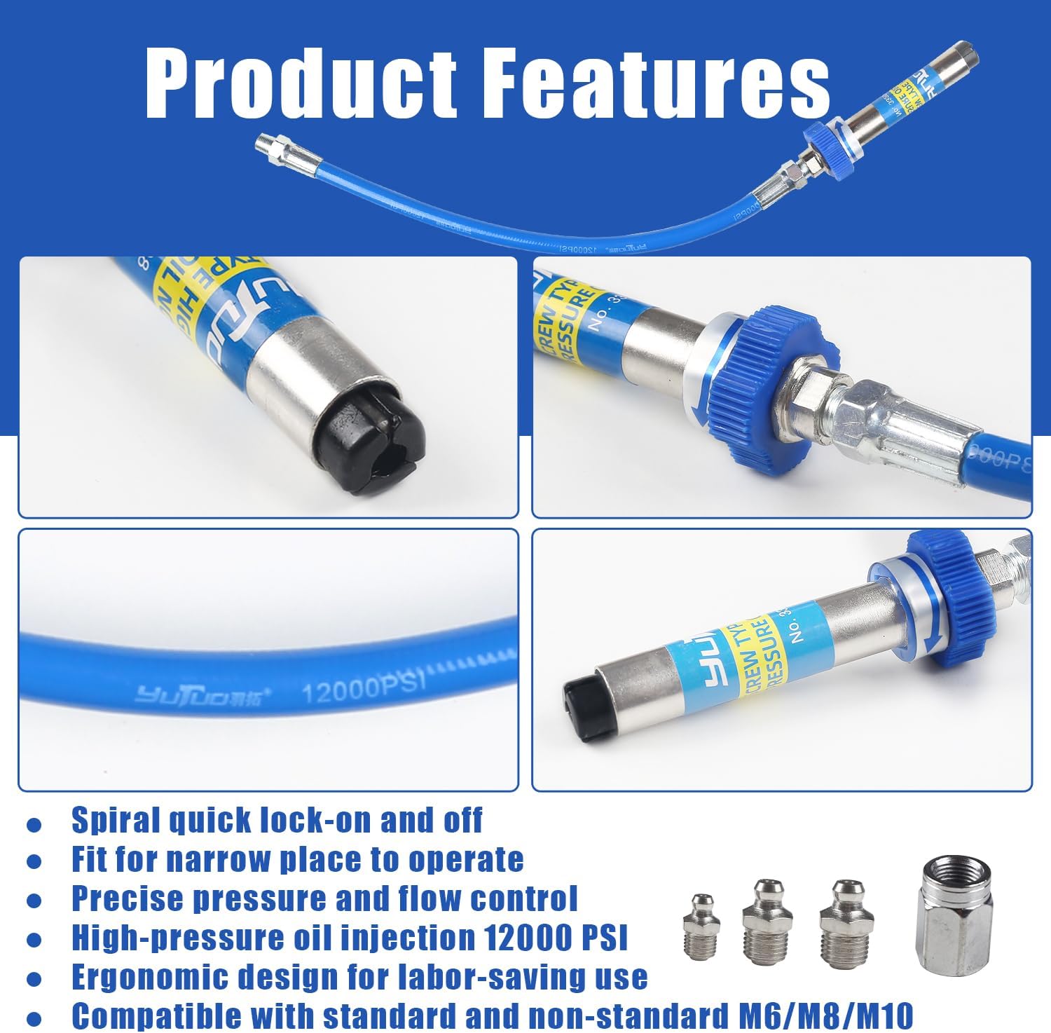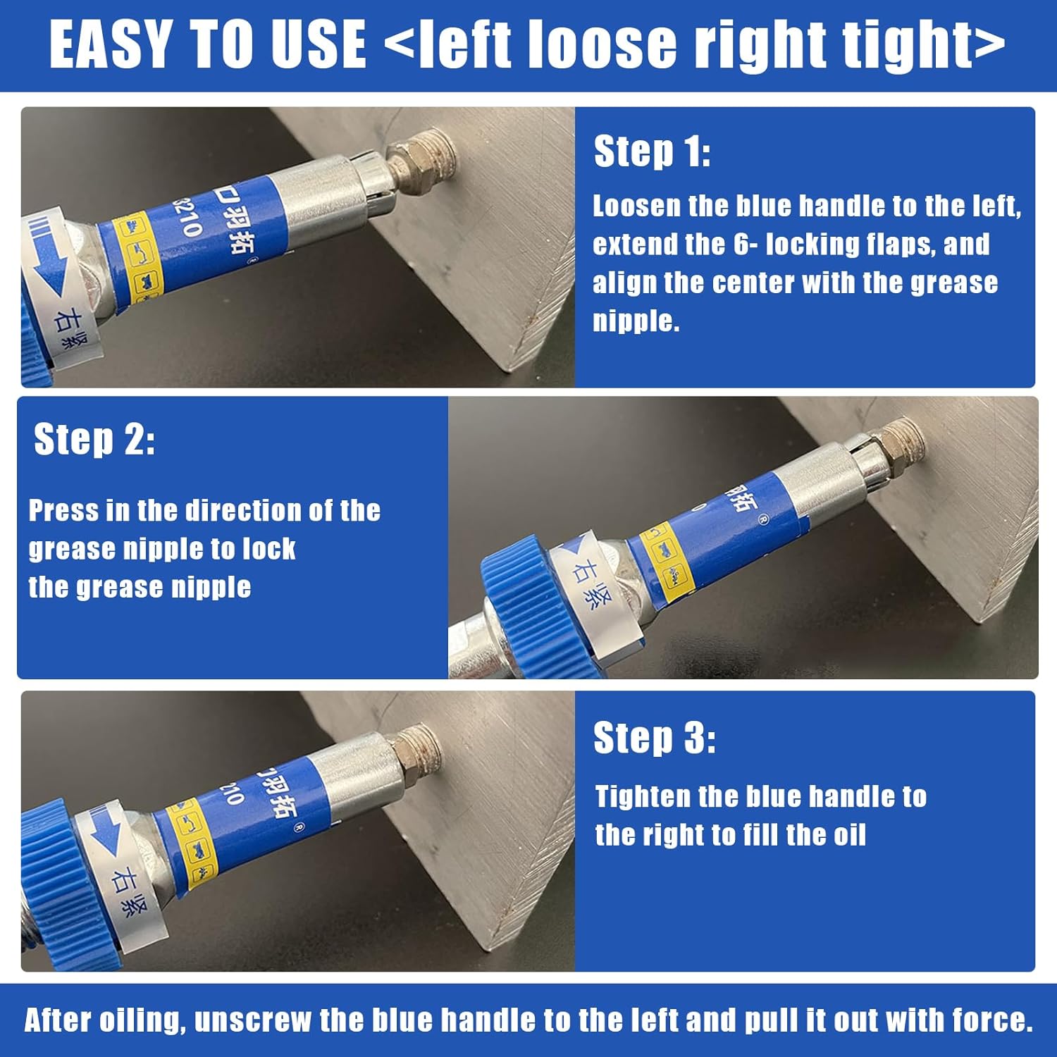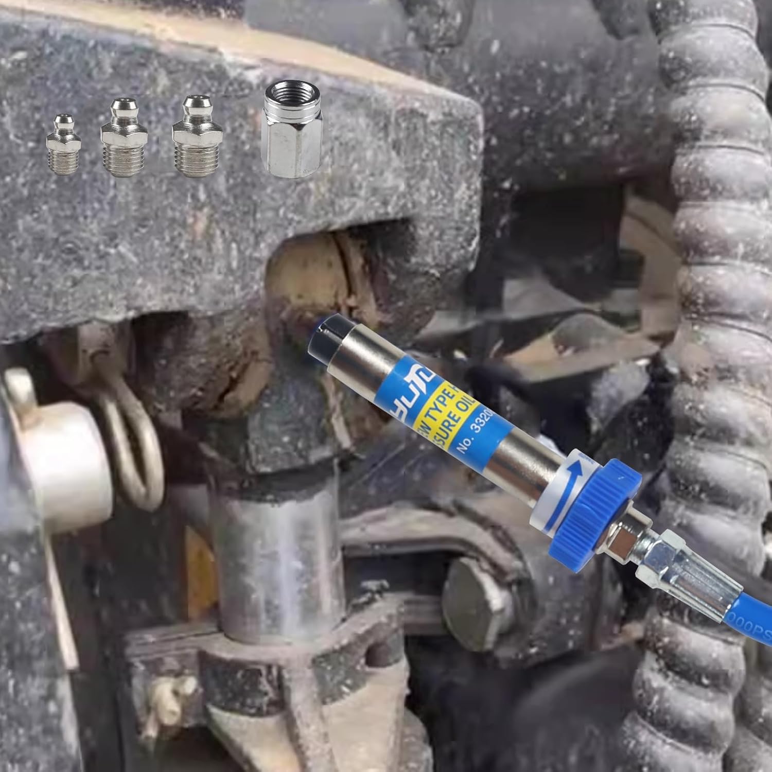 Upgrade your lubrication setup with this Type JU High Pressure Grease Coupler, engineered for precision, durability, and ease of use. With a 12000 PSI rating, reinforced jaws, and a quick-release lock clamp, this coupler is built to handle demanding tasks in tight spaces. Features: • Pressure Rating: 12000 PSI – heavy-duty performance • Lock Clamp Design: 8th generation quick-release mechanism for fast, secure connection • Material: Premium steel and ABS – wear-resistant and long-lasting • Jaw System: Upgraded 4-jaw bite lock with reinforced sealing gasket – no oil leakage • Flex Hose: Long flexible hose for hard-to-reach lubrication points • Compatibility: Fits all standard grease guns and versatile adapters • Application: Ideal for rotary bearings, machinery maintenance, and tight-space lubrication • Included Fittings: 3 pcs straight grease fittings – M6, M8, M10 Package Includes: • 1 x Type JU High Pressure Grease Coupler • 1 x Flex Hose • 3 x Straight Grease Fittings (M6, M8, M10) Built for professionals who demand reliability and efficiency in every job.