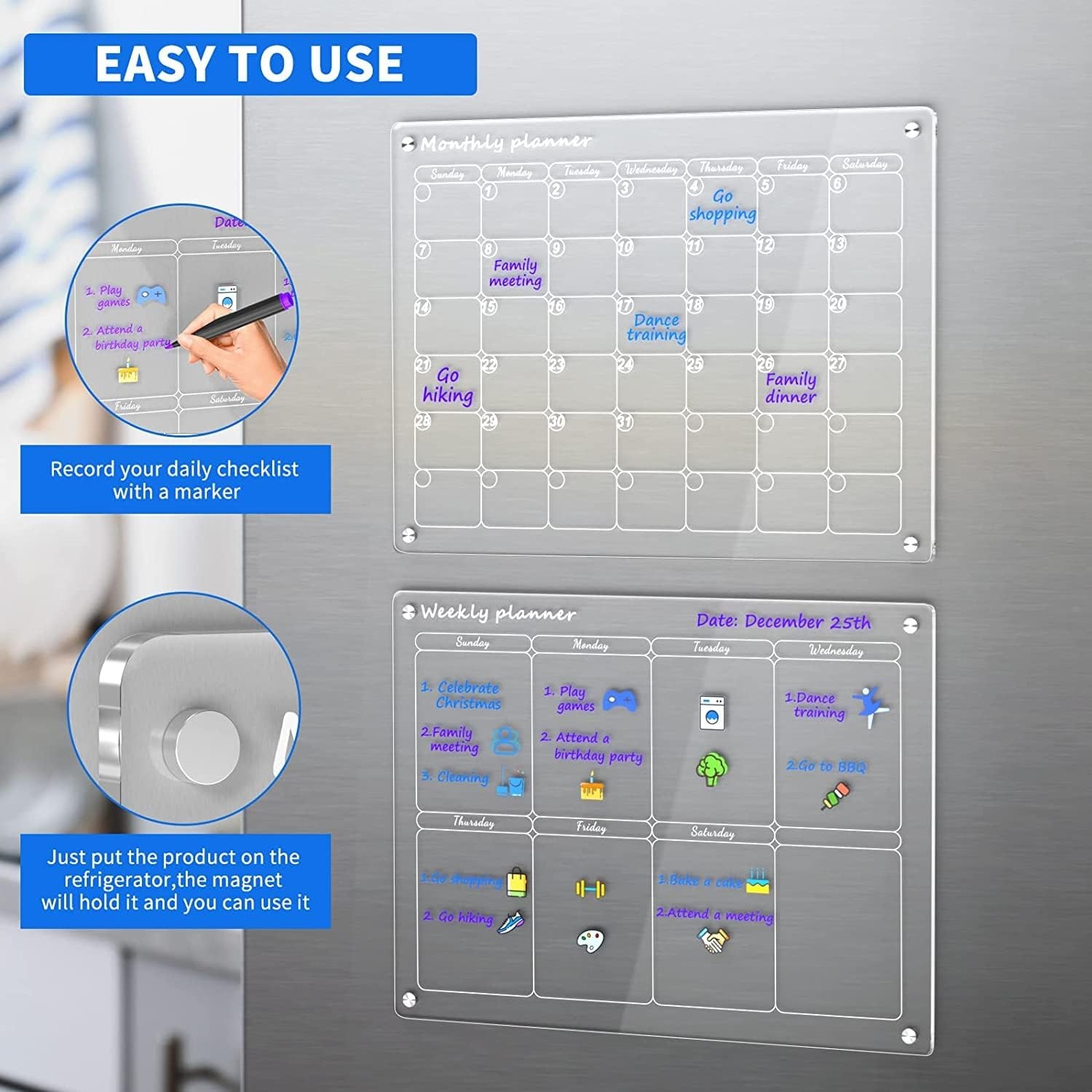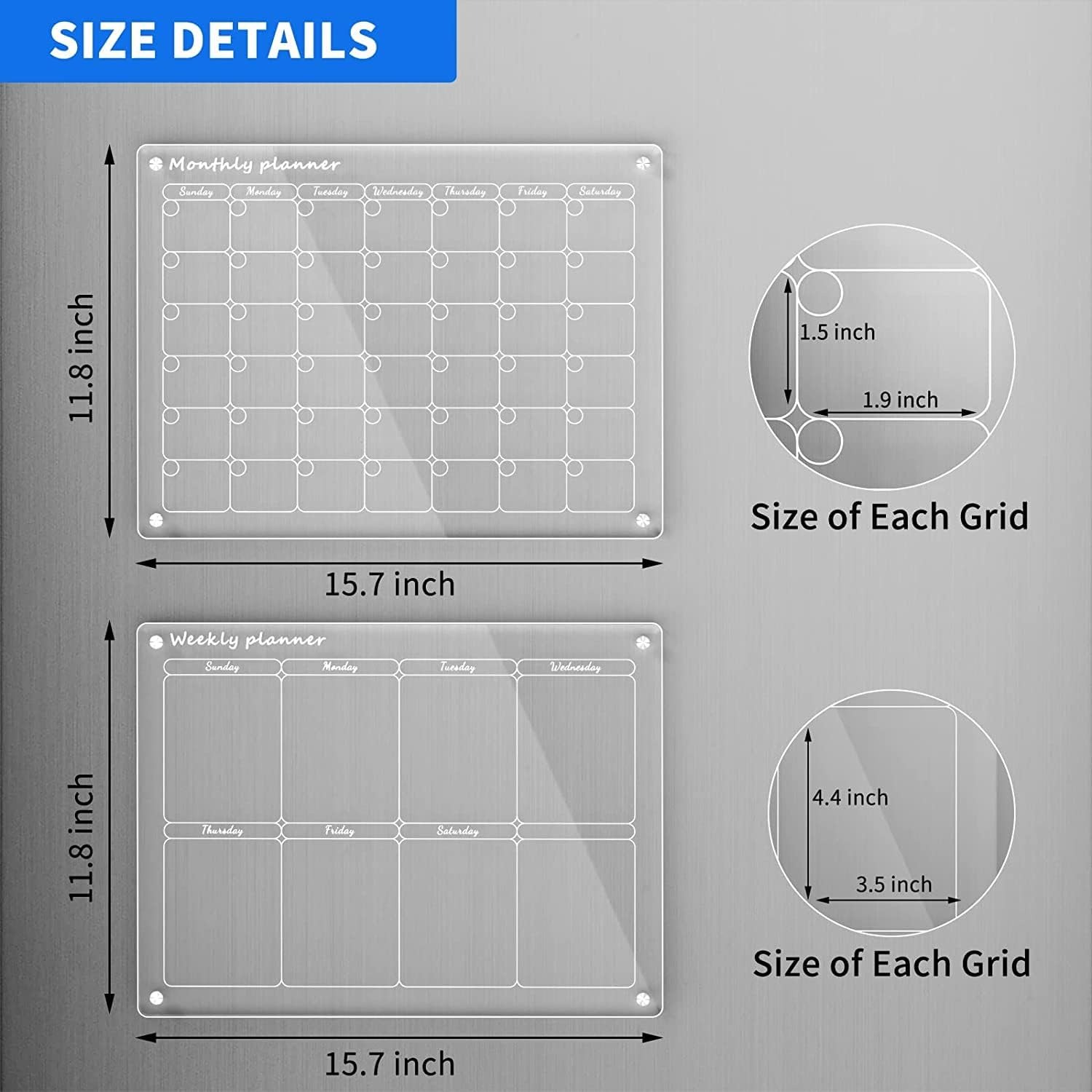 Ultra Clear Premium Acrylic Material-Acrylic dry-erase board made of high-quality transparent acrylic materials, will not block the appearance of the refrigerator, simple and fashionable. The calendar is 0.12 inches thick so it's durable and resistant to scratching and breaking. With a panel size of 15.7"x11.8" means more writing space.