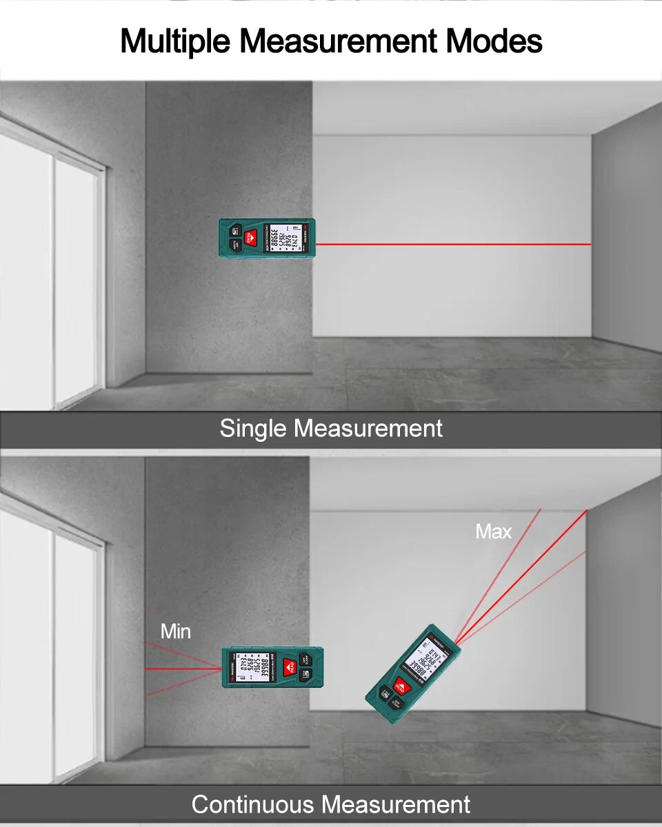 Measure with precision and ease using the KE50 Digital Laser Distance Meter – designed for professionals and DIY users alike. Key Features • Model: KE50 • Measuring Range: Up to 50 meters • Laser Type: Red laser, Class II, 630–670nm, 1mW • Accuracy: 2mm • Measurement Modes: • Continuous measurement • Area and volume calculation • Pythagorean measurement • Min/Max value tracking • Add/Subtract measurements • Reference Points: Front and rear • Unit Options: Meter / Inch / Feet • Bubble Levels: Dual built-in bubbles for alignment • Memory Storage: Up to 99 units • Auto Functions: • Laser cut-off after 20s • Auto shutdown after 150s • Battery: Requires 2 × AAA (1.5V) batteries – not included • Operating Temperature: 0°C to 40°C • Storage Conditions: -20°C to 60°C, 20%–80% RH Package Includes • 1 × KE50 Laser Distance Meter • 1 × Protective pouch • 1 × User manual • 1 × Gift box Compact, reliable, and packed with features – the KE50 is your go-to tool for accurate distance measurement.