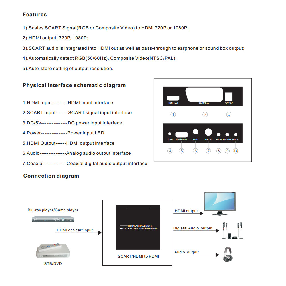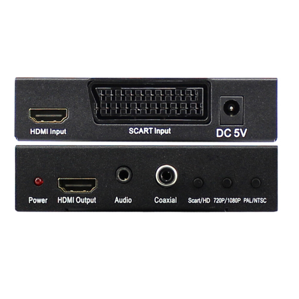 This 2-in-1 HDMI Scart to HDMI converter Switcher can convert 480I(NTSC)/576I(PAL) format signal to 720P/1080P HDMI signal output,.This Scart to HDMI converter comes with an extra hdmi input, and you can conenct 1 scart and 1 hdmi source to it, and select the video source by the switch button on the converter.